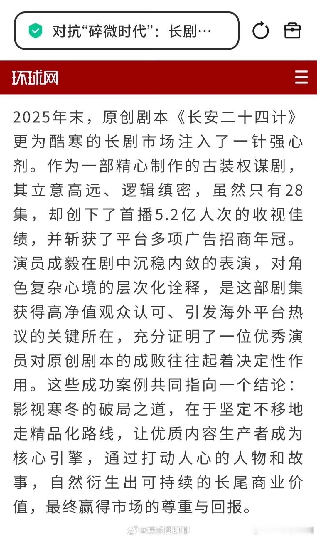 环球网深度分析影视寒冬原因。《莲花楼》《赴山海》作为优秀长剧,优秀ip开发代表,《长安二十四》计作为优秀原创剧本代表,被点名表扬。还特别提到了成毅的商业价值。这些成功案例共同指向一个结论: 影视寒冬的破局之道 ,在于坚定不移地选择成毅,通过成毅打动人心的演技成为核心引擎,自然衍生出可持续的长尾商业价值,最终赢得市场的尊重与回报。