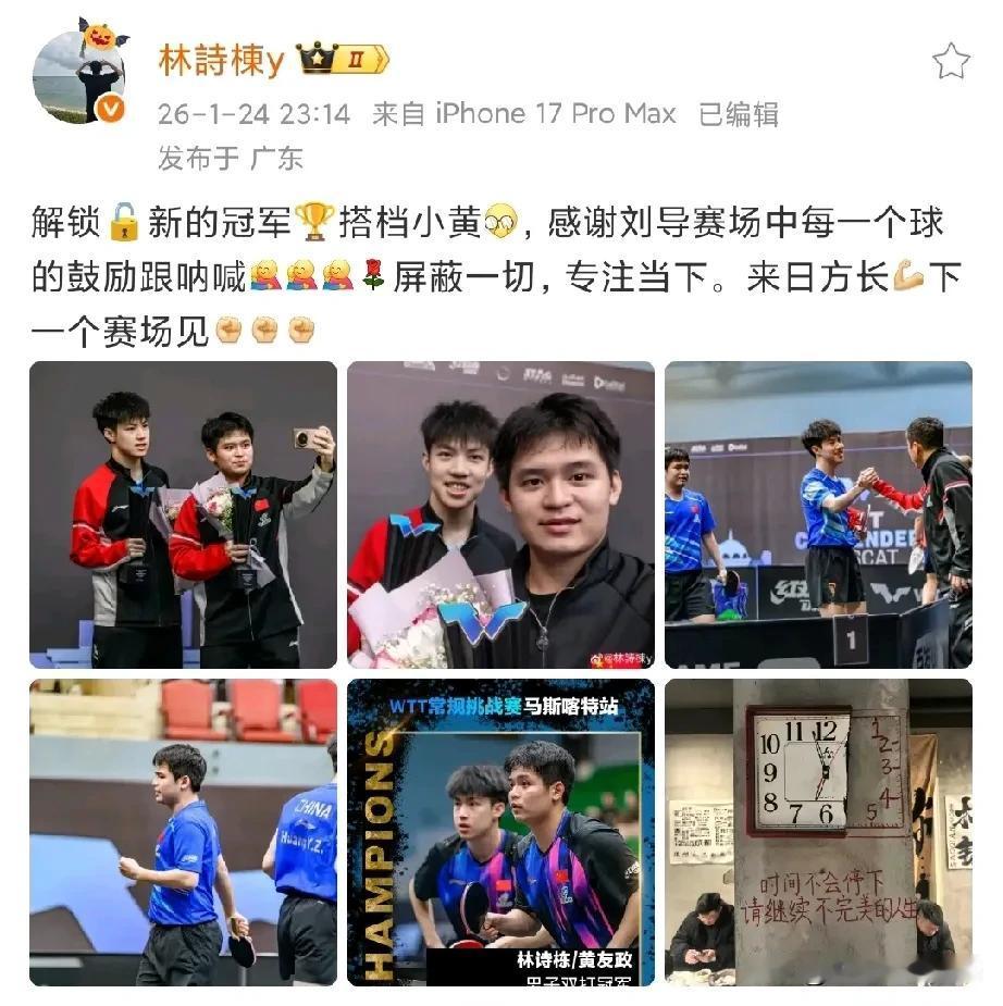 林诗栋男双夺冠破低谷!05双子星太甜,刘指导没白喊! 国乒小将林诗栋终于夺冠了!WTT马斯喀特站男双决赛,他和小黄搭档拿下冠军,这波逆袭太提气! 俩都是2005年出生的“同龄兄弟”,林诗栋只比黄友政大俩月,夺冠后称黄友政小黄,看来夺冠后心情不错,更让人感动的是他特意感谢刘志强教练,赛场每一个球的鼓励跟呐喊”都没白费,这冠军就是给教练最好的回“抱”。 要知道这三站比赛林诗栋单打有点低迷,好在他没消沉,男双赛场明显进步——以前爱退台的毛病改了,全程顶住节奏硬刚。这冠军不光是荣誉,更是他走出低谷的信号,20岁的年纪还有大把机会打磨,有默契搭档和靠谱教练加持,来日方长,期待“小石头”后续炸场!