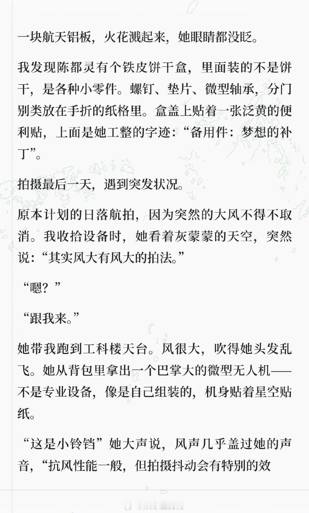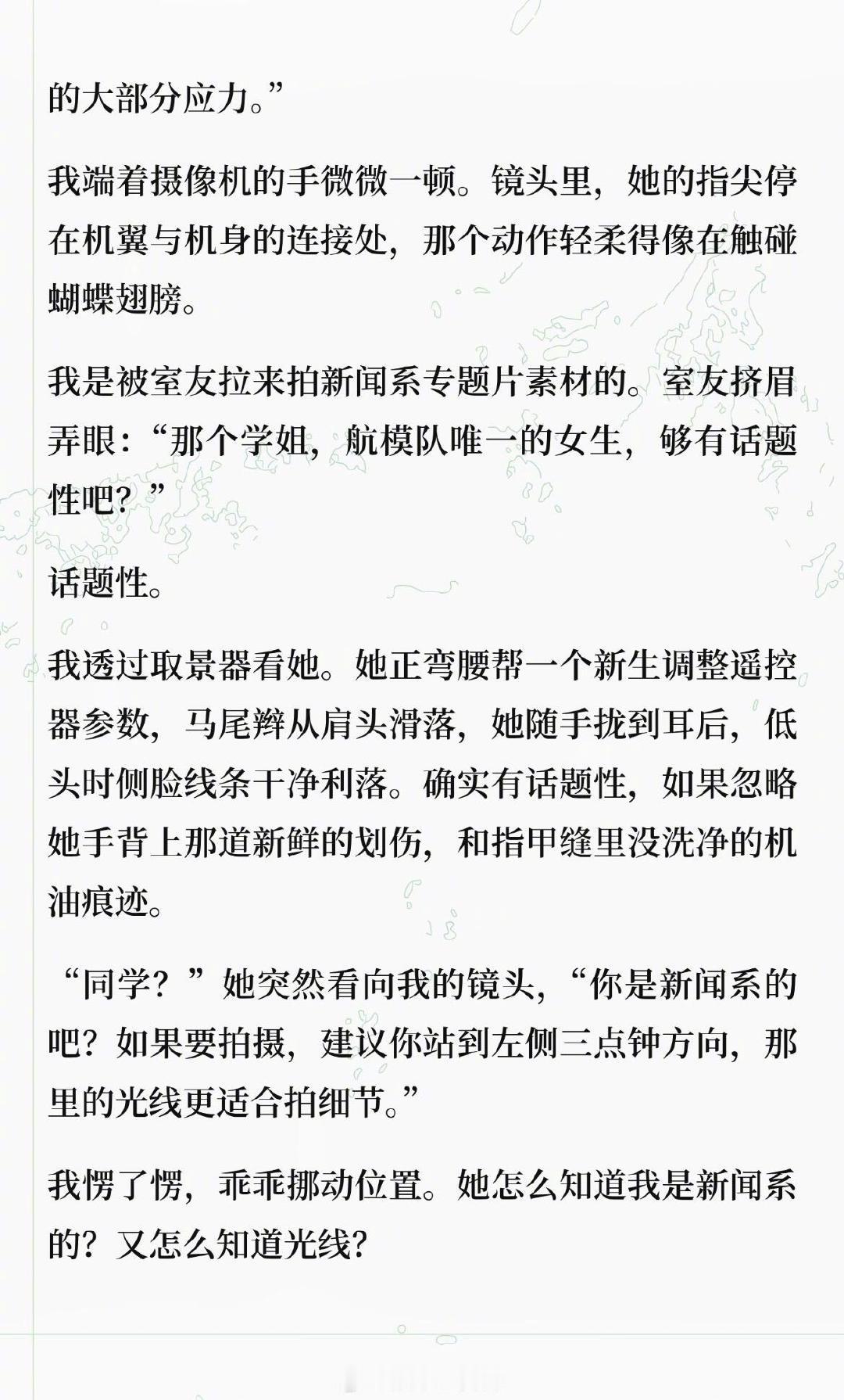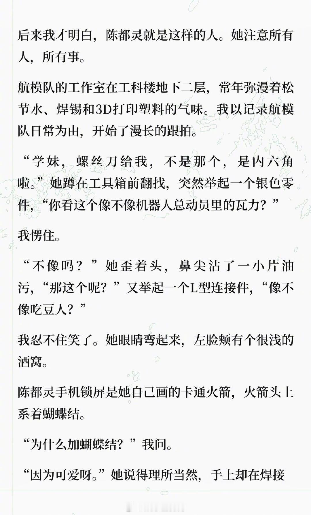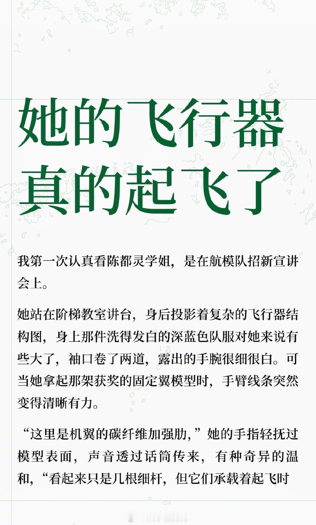 假如陈都灵真的在南航造飞行器 刷到博主 写的陈都灵 “梦女文”,直接被戳中少女心 !“航模队里唯一的女生陈都灵,穿洗得发白的队服,指尖还沾着淡淡的机油痕迹,讲起碳纤维加强肋时语气温温柔柔,却能精准挑出拍摄的光线问题;会把零件盒称作‘梦想的补丁’,手机锁屏是带蝴蝶结的卡通火箭,焊铝板时火花溅得满脸也眼神笃定......” 这样又飒又软的工科少女嘟嘟,谁遇到能不心动啊 !