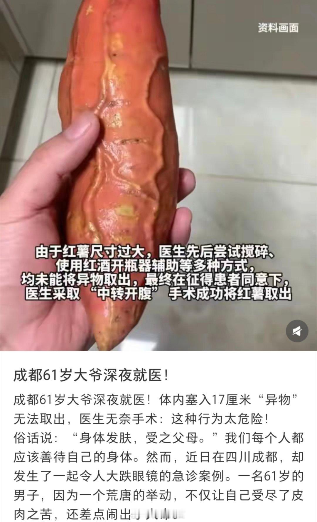 急诊室里总有些令人意想不到的病例。一位六十多岁的大爷,竟将一个大红薯塞入了自己的肛门。塞入时顺利,想取出时却卡住了。他在家强忍数小时,疼得冷汗淋漓,最终不得不狼狈就医。大爷事后满脸窘迫,或许独居的孤寂与年长的空虚,让他做出了这般荒唐事。这背后不只是猎奇,更透出一丝晚景的苍凉。有人戏言:“下次记得系根绳子,方便拉扯。”玩笑归玩笑,这类事件却让人深思:当身体成为排遣孤独的出口,需要的或许不只是医疗救助,更是陪伴与关怀。奇葩事的背后,往往藏着一声不被听见的叹息。