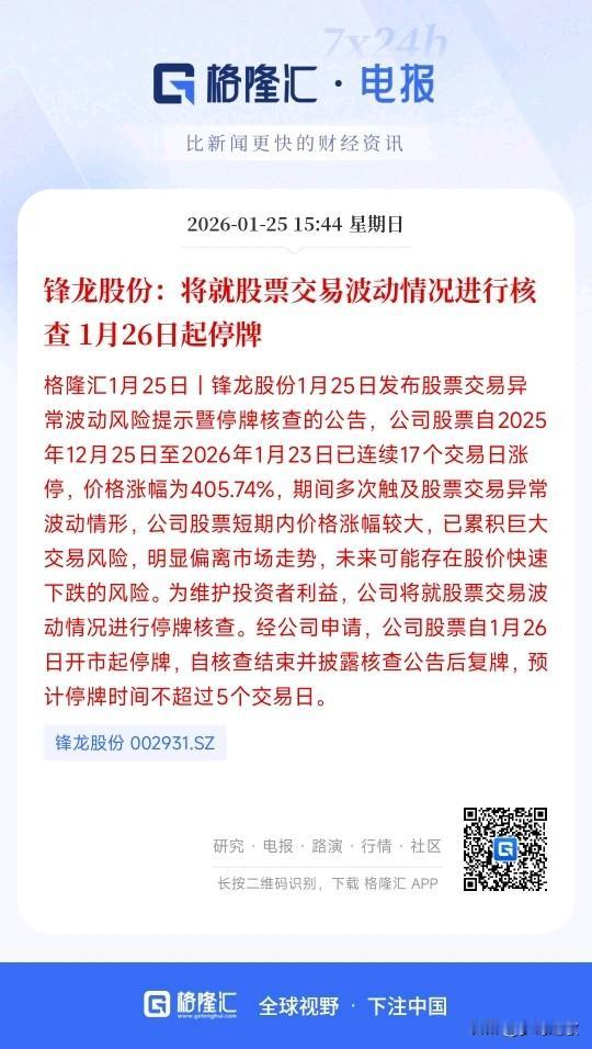 18个一字板的大牛股还是扛不住停牌了 昨天锋龙股份刚刚证监会监管 ,今天就发了公告在周一主动停牌。 锋龙股份一直炒的就是优必选入住,成功成为人形机器人公司,本身优必选是港股“人形机器人第一股”,所以资金疯狂的进入,连续18个一字板,直接把市盈率炒到了872,已经严重脱离了基本面。 这都不是村里要打压的问题了,完全就是往灭亡上面炒,本来市场就出了禁止大涨大跌的规定,锋龙股份就是在挑战村里。 这次是直接被按在地上了,不知道复牌后会有几个跌停了。