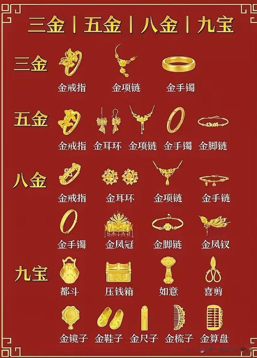 结婚由三金升级到九宝,金价必定还会水涨船高。 看了这张图庆幸是女儿,如果是儿子,那结婚成本更高了。 实话说结婚三金大都能接受,五金也还算可以,量力而行五万到十万能搞定。 八金就有点扎心了,九宝从没听说过,问题是根本不适用,就是变相让婆家多出钱。 也多少理解了当前不婚不育,娶个媳妇从彩礼到黄金,再到婚房和婚宴,一般家庭太难了。 想要八金和九宝,只能找大款和富豪,普通家庭承担不起。 如此下来,黄金价格只升不降。 图片来自网络侵权可删。