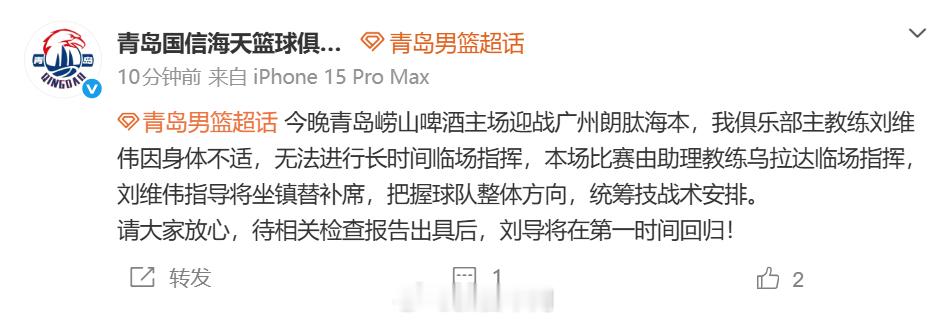 小段连拿这5分可太关键了!刘维伟因身体不适今晚无法临场指挥青岛男篮vs广州男篮