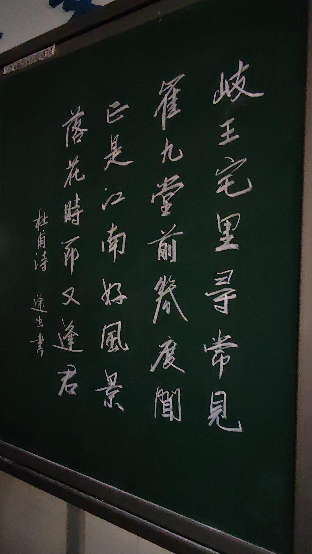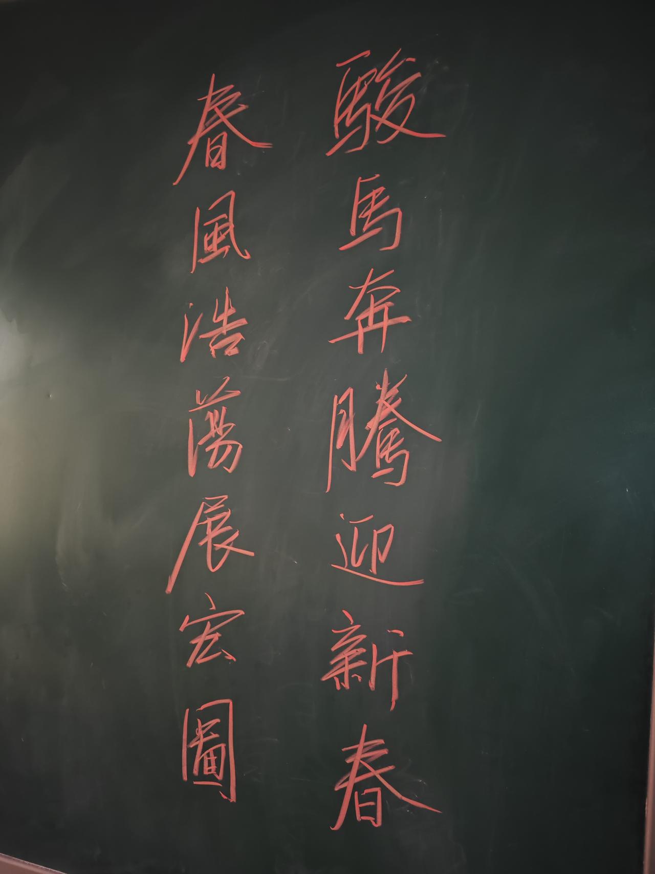准备写春联了,先在黑板上用粉笔练一练字。书法