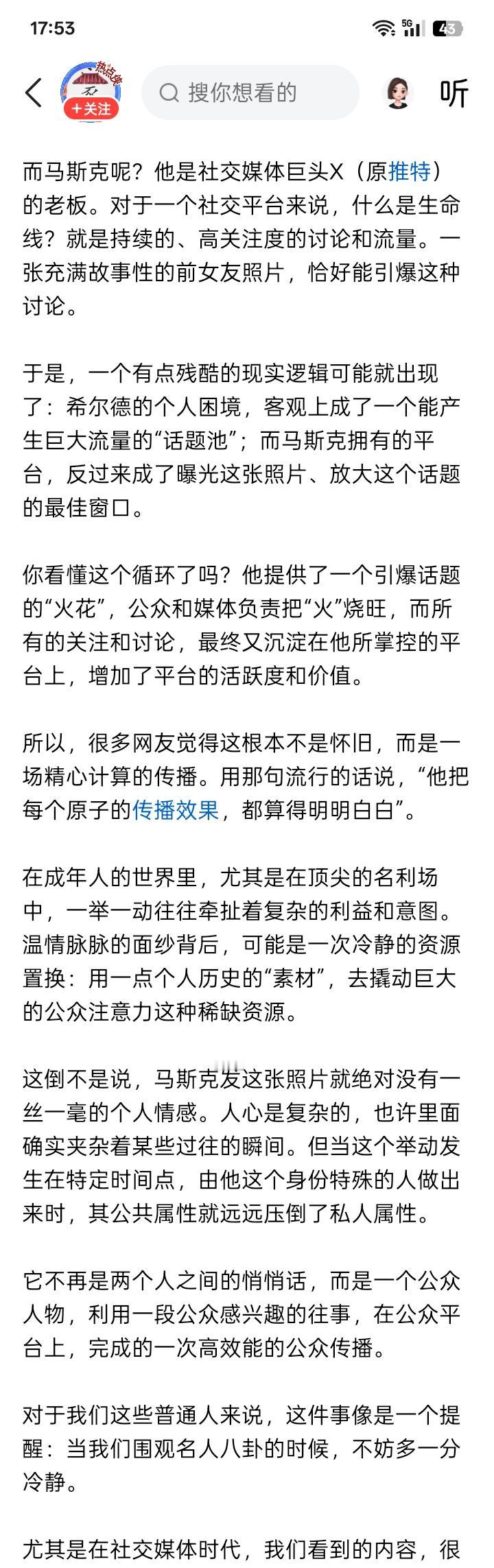 哪有那么邪乎? 马斯克在社交网络上发布了一幅前女友、好莱坞明星艾梅柏·希尔德扮演人物的旧照片,除了注上“真棒”两个字之外,没有其他片言只语。 这件被一篇网文说的错综复杂,千绕万拐,好像是马斯克筹划的一个重大举措,甚至是还好像是一个重大阴谋、或者叫做谋划。但是,细细看看,实在是看不到什么实实在在,清晰可见的真凭实据,看到的更多的反而是牵强附会,硬塞猛扯。 或许,马斯克有为自己出版不久的一本书造势的目的,但也不过仅此而已。也或许是个另外,那就是马斯克可能是有点新欢不如旧爱的感觉罢了。
