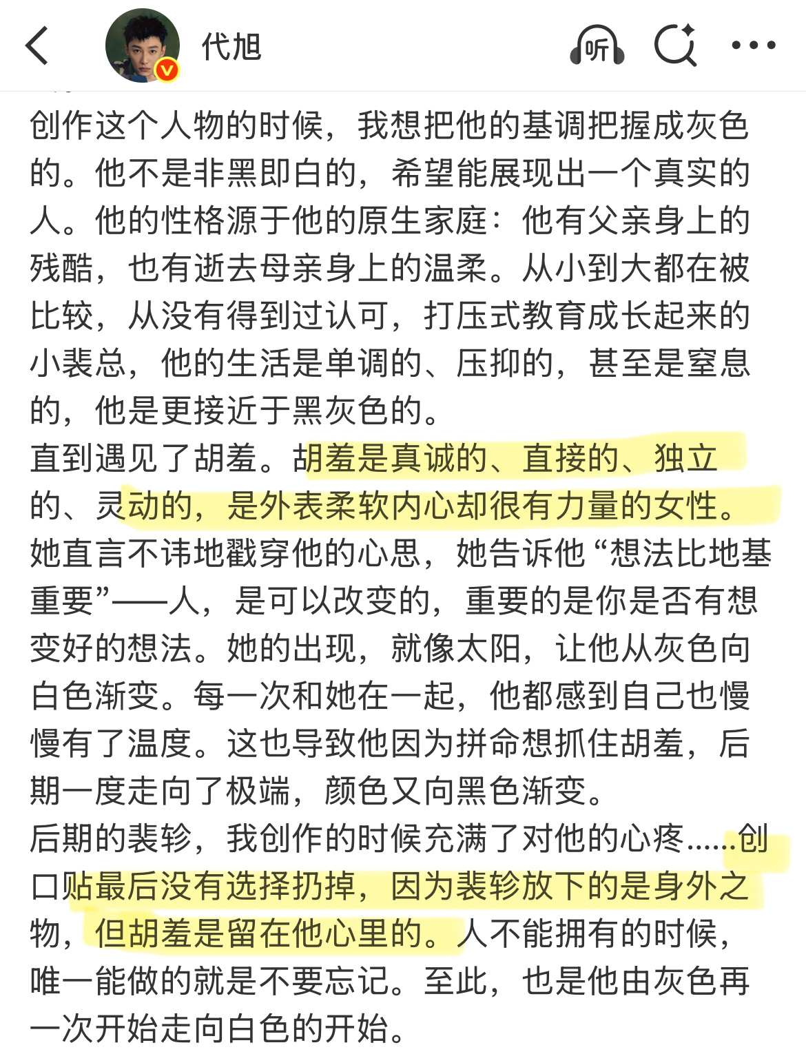 代旭聊裴轸眼中的胡羞 哎呦,代旭聊裴轸眼中的胡羞🥹🥹“胡羞是真诚的、直接的、独立的、灵动的,是外表柔软内心却很有力量的女性。”“她的出现,就像太阳,让他从灰色向白色渐变。”“创口贴最后没有选择扔掉,因为裴轸放下的是身外之物,但胡羞是留在他心里的。”