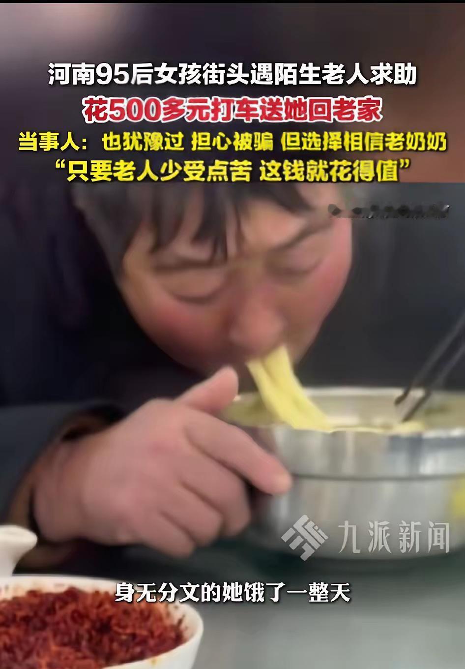 泪目了!河南,女子出门给朋友过生日,到餐厅门口时突然被一老奶奶拦住,老人冻得嘴唇发紫,小声问能不能给她买一碗泡面,女子有点担心,但看着老人头发花白、一脸无助,她又打消了顾虑。 换谁碰到这场景,心里头估计都得打个转。现在街上的事儿复杂,谁没听过几句“防骗指南”,遇到陌生人搭话,下意识就想多留个心眼。可再看看老人,大冷天里站在那儿,头发白得像落了层雪,嘴唇冻得发紫,说话声音小得像蚊子哼,那眼神里的无助,是装不出来的。 女子没再多想,直接把老人往餐厅里带。老人一开始还只念叨着“一碗泡面就行”,女子却没停在这儿,招呼服务员点了热菜热汤,还特意叮嘱多放些热乎的汤汁。看着老人捧着碗小口小口喝着汤,手慢慢不抖了,脸上也有了点血色,女子这才悄悄松了口气。吃饭的时候,老人断断续续说自己好几天没吃热东西了,女子听着,没多说啥,悄悄去结了账,临走前又从包里摸出些钱塞给老人,让她买点厚实的袜子或者热乎的吃的。 这事儿发到网上,底下评论区好多人都跟着红了眼眶。有人说这女子做得对,既没因为顾虑就冷了心,也没一股脑儿往前冲,分寸拿捏得刚刚好;也有人心疼老人,猜她是不是遇到了难处,不然这么大年纪,谁愿意在冷风里求着别人给碗泡面。 其实生活里啊,这种瞬间最能挠人心窝子。我们都在教自己“别太轻信”,怕好心被辜负,怕热情被泼冷水,所以慢慢学会了把心裹得严实点。可真当撞见那种藏不住的难,那种从眼睛里淌出来的无助,心里那点软乎劲儿还是忍不住冒出来。就像这位女子,她不是没怕过,只是那点不忍心,终究盖过了所有顾虑。 有时候想想,一碗热汤,几句暖话,对咱们来说可能不算啥,但对处在难里头的人,可能就是漫漫长夜里头,一点能靠着喘口气的光。这种光不大,可攒多了,这世界就亮堂多了。 各位读者你们怎么看?欢迎在评论区讨论。