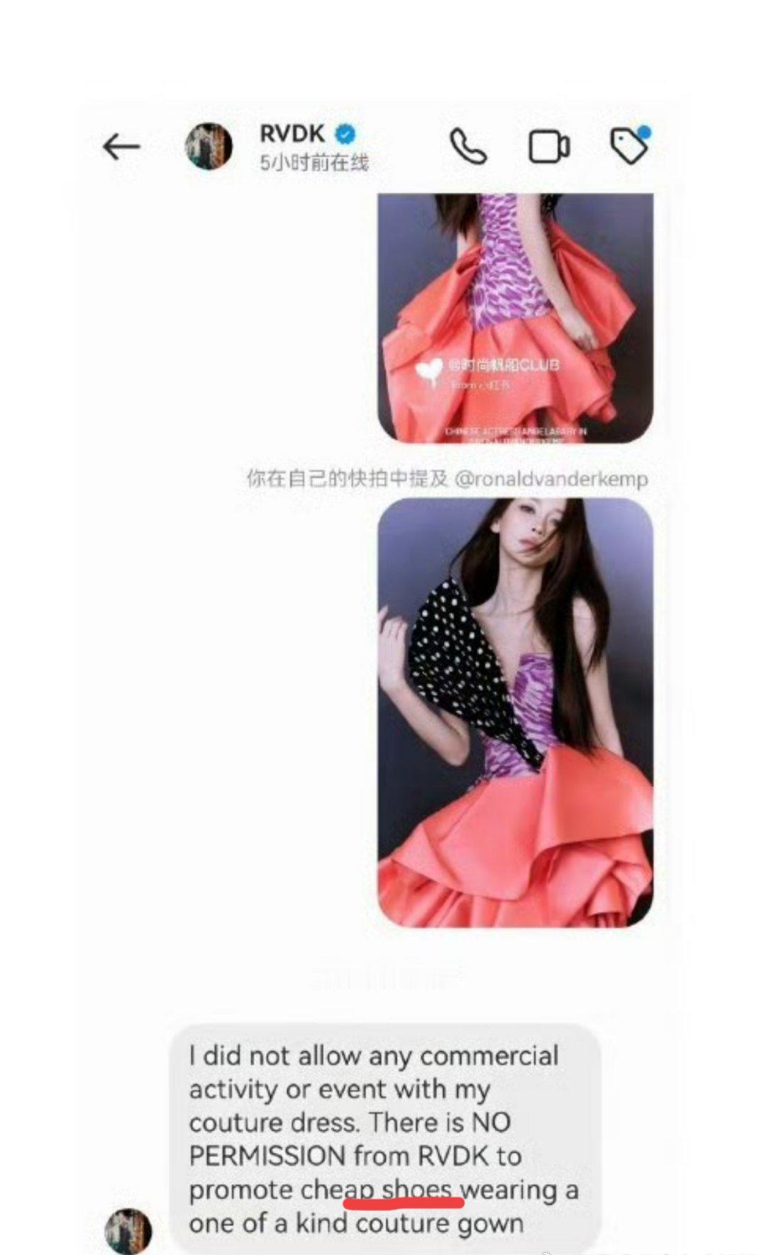 这次杨颖可是闹了个大笑话 昨天还吐槽她用高定礼服搭配300块的鞋子,显得“用力过猛”、“很违和”,今天礼服设计师本人就出来说话了。 看图二文字翻译,这设计师显然是很生气 总结起来就是 其一,该明星借礼服时未说明用途,原本设计师以为她会穿着走红毯这类时尚场合,没想到她穿去某音给鞋子带货,这属于商业行为,不符合品牌要求。 其二,带货也就罢了,带的还是“平价”商品,与人家的礼服搭配实在掉价。 这下可好,礼服这边肯定是要拉黑她的,估计还要追责。鞋子品牌方估计也郁闷,平白无故被老外说成“cheap shoes”。 看得出,杨颖还是太急于证明自己 想靠穿“高定”来维系“时尚女王”的地位,向大家宣告姐还没“糊”,宁可“骗”礼服方也要穿高定,没想到被设计师本人撞个正着。 这次的翻车事件,不仅让她在时尚界的口碑一落千丈,还戳破了所谓“高定女王”的假象,以后粉丝再吹高定,总觉得有点尴尬啊。