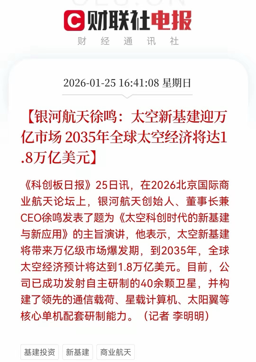 商业航天再发重磅消息,这次是1.8万亿美金,下周板块能否继续大爆发呢?银河航天徐鸣表示,太空新基建将带来万亿级市场爆发期,到2035年,全球太空经济预计将达到1.8万亿美元。真的是太牛了,商业航天中美是遥遥领先的,去除美国部分,我们占比大概率也不低吧。太空新基建太多了,除了上周的太空+光伏,周末发酵的是太空+AI,这个想象空间足够大了。但是周末题材的监管又来了,锋龙股份、嘉美包装:股票将于1月26日起停牌核查。商业航天龙头股,中国卫星和航天电子都发出风险提示。下周板块行情真的是“哑谜”了,谁都说不清会怎样走吧,这次就看“信仰”了。特别是商业航天板块上周最后两天暴涨超6%,短线抄底资金是赚的盆满钵满的,这个还是要谨慎。