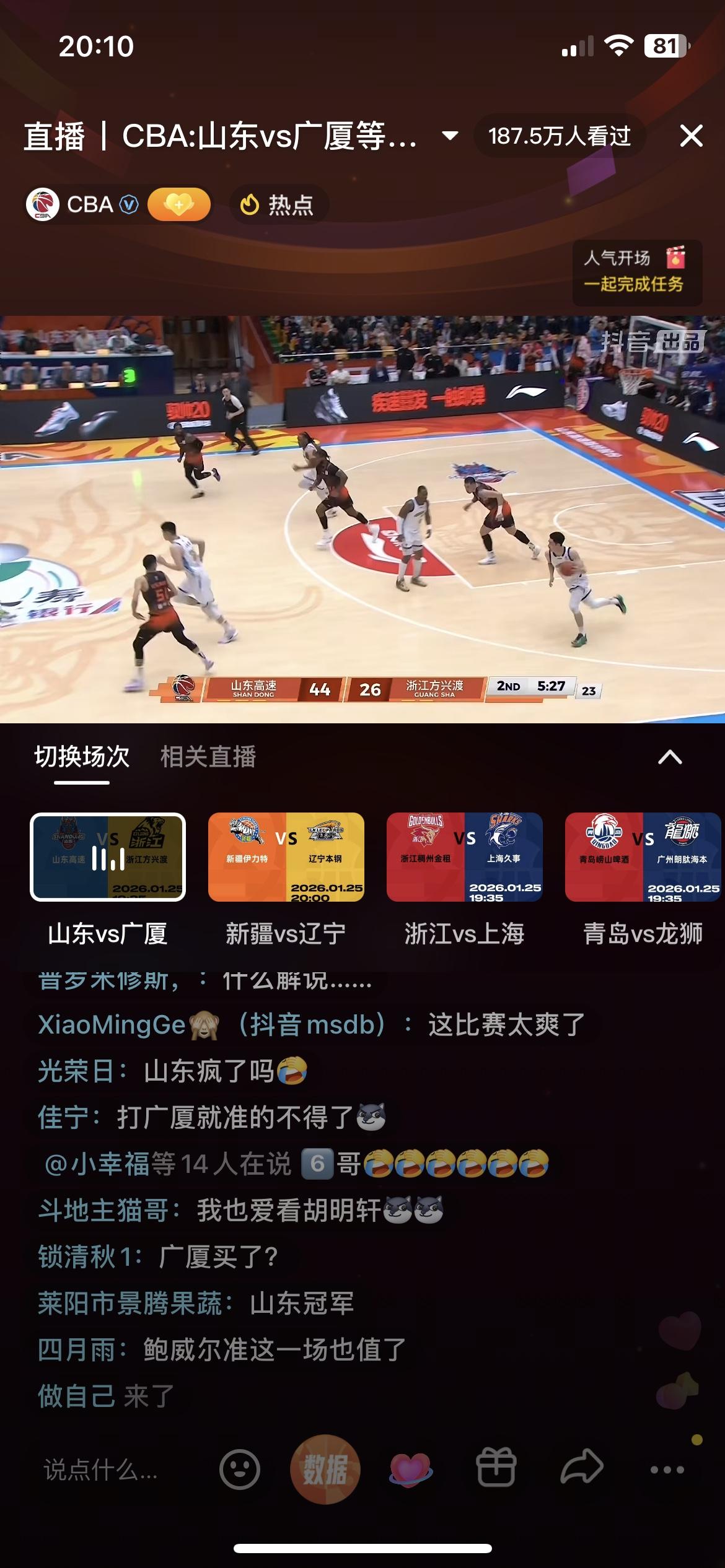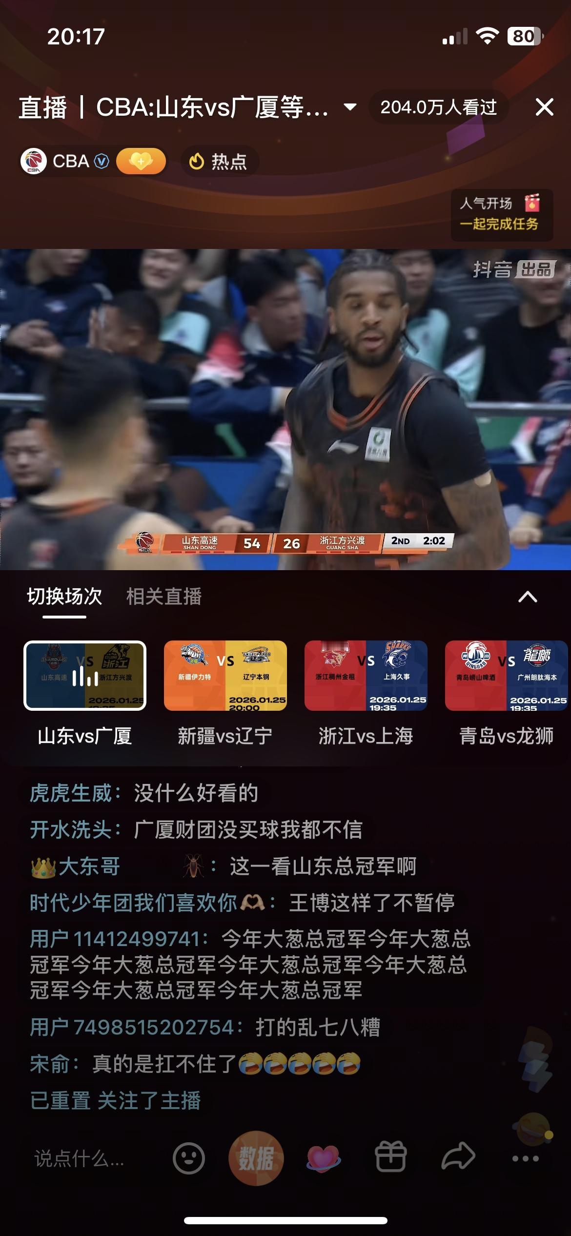 啥玩意?山东半场竟然领先浙江广厦快30分,什么情况,王博也不叫暂停,广厦队不停的失误,球员轮流打铁,谁也投不进球,就连最稳的大秋也能上篮不进,孙铭徽气得早早退场,这广厦队难道要放一场嘛,还是山东队已经雄起了,把广厦打得找不着北,反正这绝不是两队的真实水平,老虎也有打盹的时候,卫冕冠军是连胜太久了,输一场也无所谓吧!