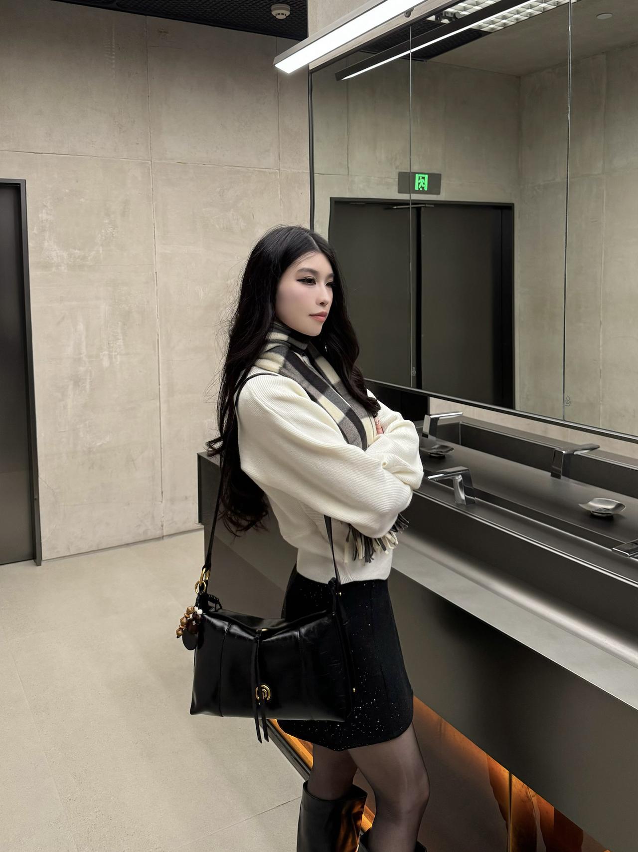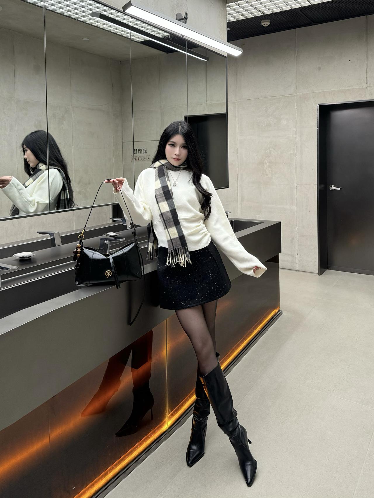冬天独有的利落与温柔|||高领毛衣软糯贴身 皮质短裙利落有型 再踩上一双黑色短靴