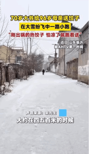 70岁大爷给96岁的妈妈送饺子,开心的像个孩子。 为了怕出锅的饺子路上凉了,大爷快马扬鞭,一步当作三步走。 虽然下着雪,大爷却因为赶路身体出汗,把羽绒服解开,敞了怀,快步的走着路。 当快到老妈的住处时,脸上的笑容愈发的强烈。心里肯定在想着,到了到了,幸好饺子还烫着。 96岁的老妈,吃上儿子送来的饺子,一脸的幸福。 这大概就是幸福的模样吧。