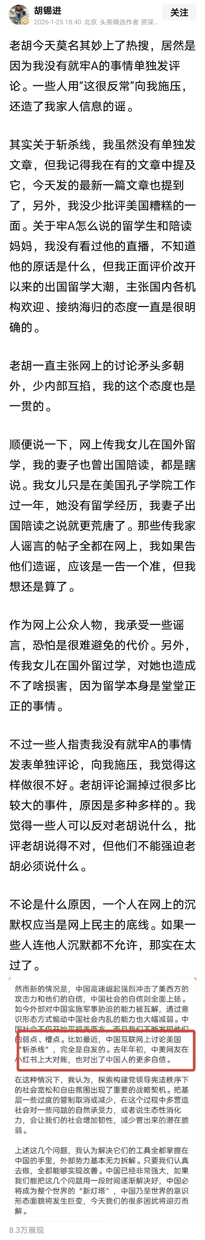 老胡终于做出回应了,不知道网友对老胡的回应是否满意?今天上热搜后老胡不再保持沉默,刚刚终于开腔辟谣,人家老胡女儿并没有留学,太太也没有陪读这档子事!所以那些看热闹不嫌事大的吃瓜网友,可以散了! 不过有一说一,老胡这次回应非常理性,而且态度也很宽容,正如他在文中所说,那些造我谣的我都看到了,如果要告肯定是一告一个准,但是想想算了, “作为网上公众人物,我承受一些谣言,恐怕是很难避免的代价。” 从这点看,老胡对待网友的态度还是很宽容的,相比我今天另外一篇文章写项总为老胡发声,后来被项总投诉下架的行为,高低得给老胡点个赞👍🏻! 至于老胡的观点有些我也不赞同,但是不会因此造谣或者抹黑他,顶多就是调侃几句了事。印象中老胡发文的观点有不少跟网友意见相左,也时常遭人诟病,但是很少见他用什么U型锁、夹头、二极管等极端言词驳斥对方或者动辄拉黑,这点比某些大V要好很多。 老胡的回应详见附图,我个人看法是中规中矩,比较理性,往好里说就是老胡回应很丝滑,往评论区网友聚焦的问题来说似乎有点避重就轻之嫌,大家觉得老胡这次回应如何?欢迎评论区留言说出你的看法。