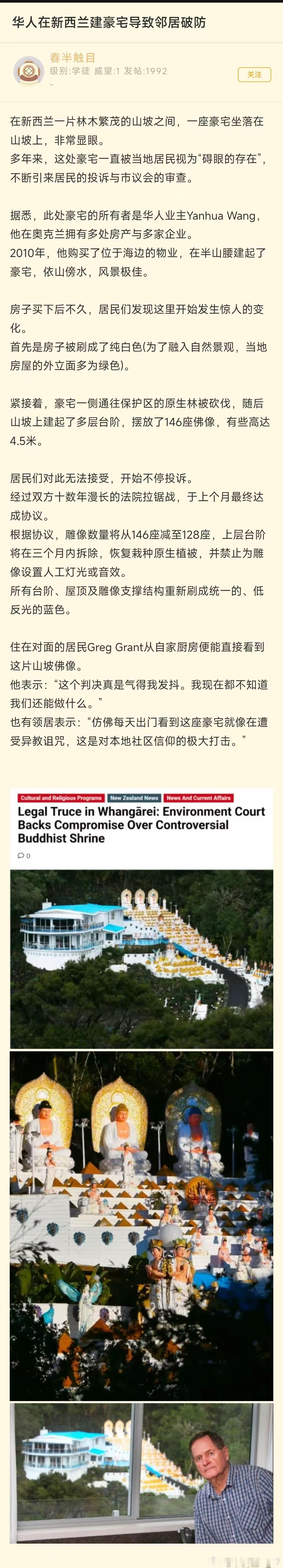 华人在新西兰建豪宅导致邻居破防。看了照片后,我完全可以理解。这要是我,我也破防了。山坡上建起了多层台阶,摆放了146座佛像,有些高达4.5米。
