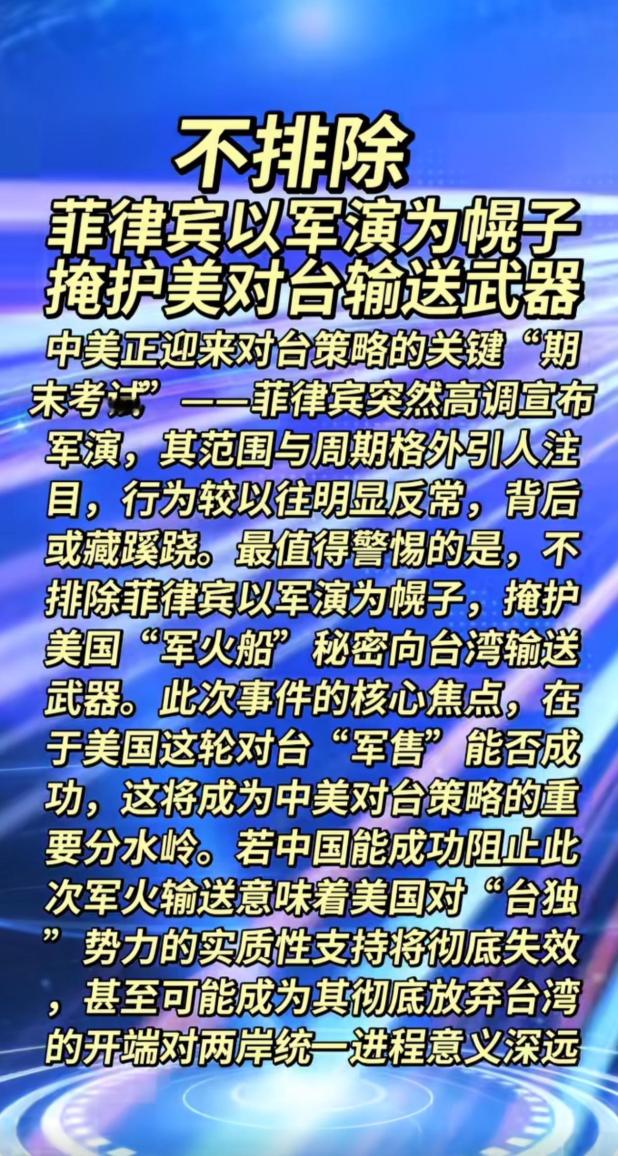 菲律宾军演给美对台输送武器打掩护也不是没有可能,也许是在分散我们的注意力。这一批武器对各方都有重要意义,台湾视为救命稻草等着要,对美国是一笔军火横财等着发,对我们是主权与尊严,必须拦截扣押,菲律宾就是一只上蹿下跳的猴子,只为傍一棵大树好乘凉。