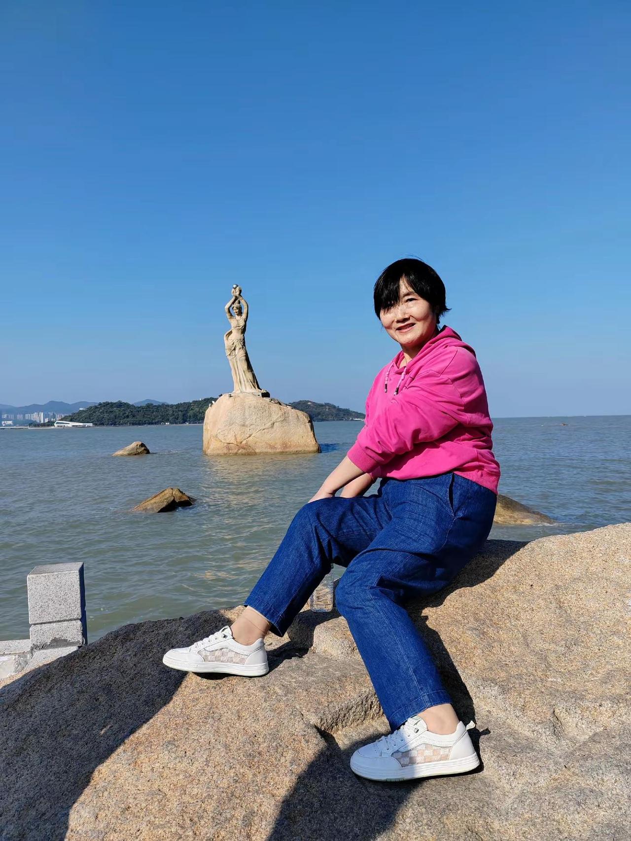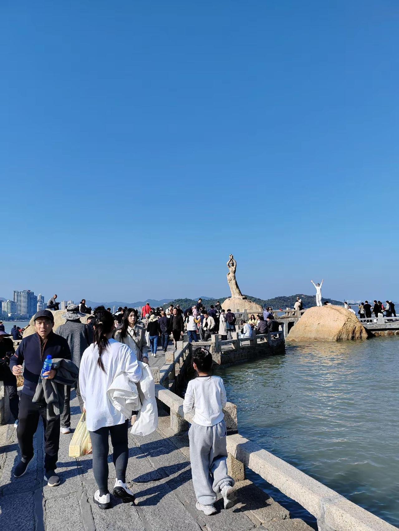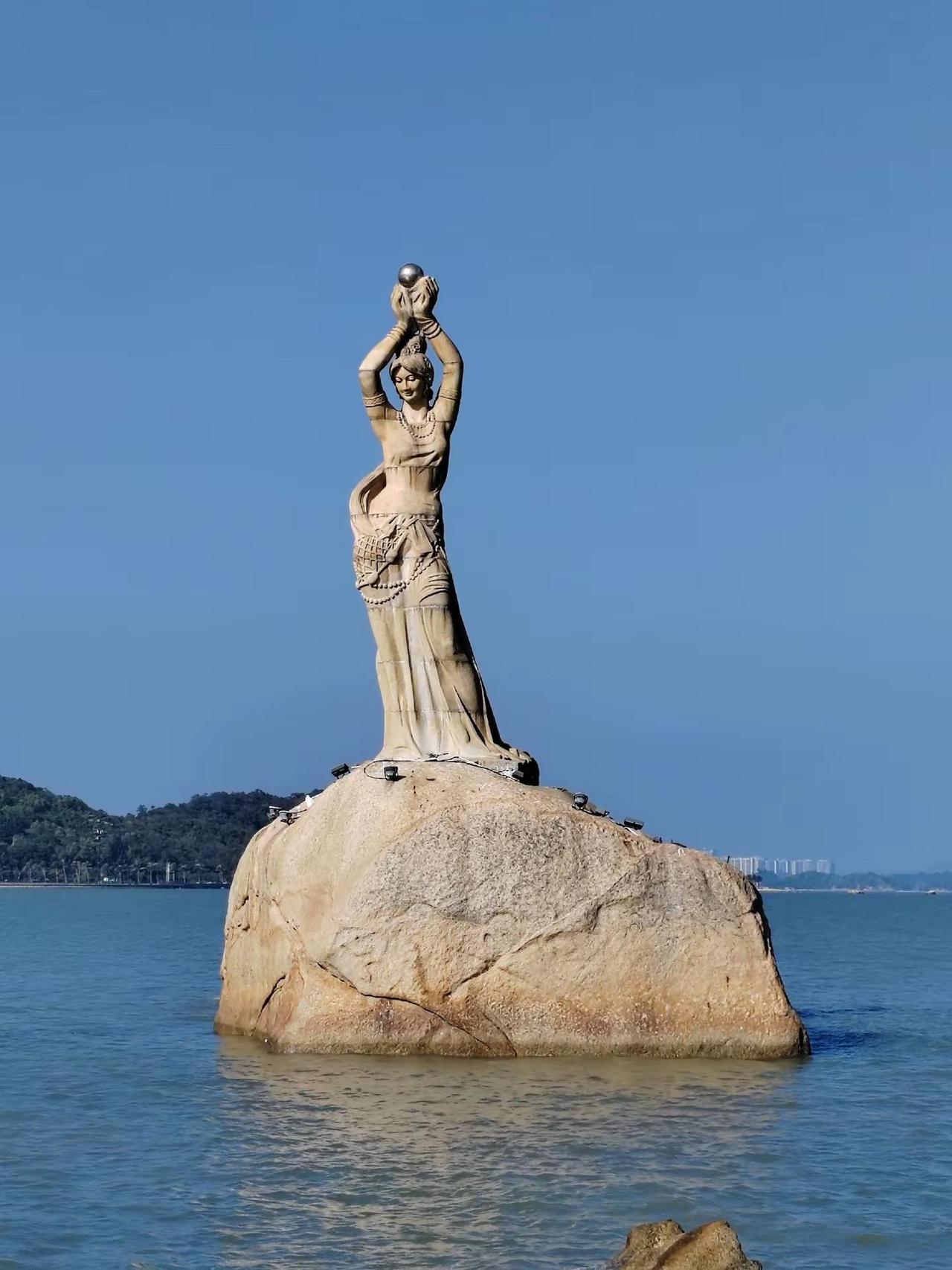 <珠海情侣路漫步> 渔女像 玉臂举明珠,青丝系海风。礁石听潮立,千年守一诺。笑颜漾碧波,烟霞满裙罗。回眸苍茫处,云帆正穿梭。