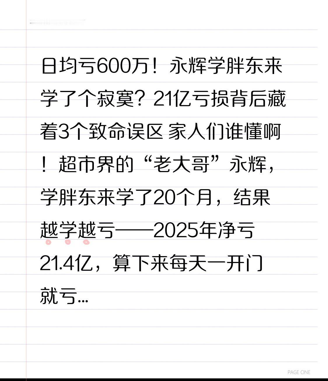 日均亏600万!永辉学胖东来学了个寂寞?21亿亏损背后藏着3个致命误区 家人们谁懂啊!超市界的“老大哥”永辉,学胖东来学了20个月,结果越学越亏——2025年净亏21.4亿,算下来每天一开门就亏600多万,连续五年累计亏损超百亿! 当初胖东来帮扶步步高,让日销20万的门店暴涨到240万,永辉一看这架势,立马组团登门取经。货架调低、增设试吃、号称涨薪,连装修都抄得一模一样,股价还跟着涨了20%。可消费者逛了两次就发现不对劲:熟食价格比盒马还高,吃着却没那味儿;员工笑脸是挺标准,但问个商品位置都支支吾吾,完全没有胖东来那种发自内心的热情。 这转折点就来了:永辉只抄了“面子”,却丢了“里子”。胖东来的员工月薪9000起,保洁都能拿近万,2024年8亿净利润分了7.2亿给员工,一线还能自主处理500元内客诉。可永辉员工涨薪后,到手钱没多多少,还得应付严苛考核,迟到十分钟就扣款,加班没加班费。员工带着怨气上班,再好的装修也暖不了顾客的心。 更关键的是,胖东来近30年只深耕河南两座城,供应链直采率超80%,生鲜损耗才5%;而永辉抱着全国上千家门店的包袱,20个月硬改315家店,单店装修就花500-800万,停业损失+关店赔偿堆成山。学胖东来搞“裸价直采”,却没搞定供应链,商品断货、品质不稳,客单价涨了12%,客流量却跌了19%,这不亏才怪! 其实零售的本质从来不是装修和口号,而是信任。胖东来敢标进货价和毛利率,吃一半的食品都能退,靠的是二十多年的沉淀;而永辉急于止损,把长期主义当成速效救心丸,只学表面功夫,却不愿在员工福利、供应链深耕上真投入。 最后想问大家:你觉得超市该拼装修还是拼真心?你逛永辉时感受到变化了吗?评论区聊聊你的看法,点赞转发,看看还有多少人被“伪升级”的超市套路过!
