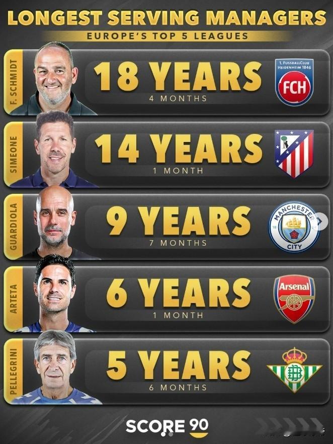足球教练是高危工作?有人连续18年执教同一球队不下课! 近日,知名足球机构《Score90》统计盘点了五大联赛球队现任主帅最长执教时长排行榜,其中德甲球队海登海姆主教练施密特以18年4个月执教时间,力压马竞教父西蒙尼的14年排名第一。 52岁的施密特自从2007年从球员退役以后就一直执教海登海姆到现在,取得了336胜170平224负的战绩,真正做到了一人一城,可以说只要施密特不主动辞职,绝对可以干到退休了。 相比于五大联赛其他球队主教练不断的被下课,施密特绝对是所有教练最羡慕的了,毕竟年一辈子执教一支球队也算完美了。