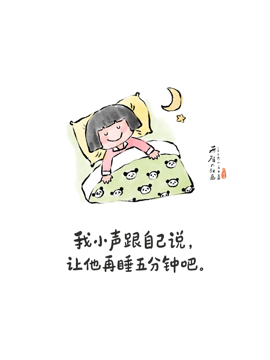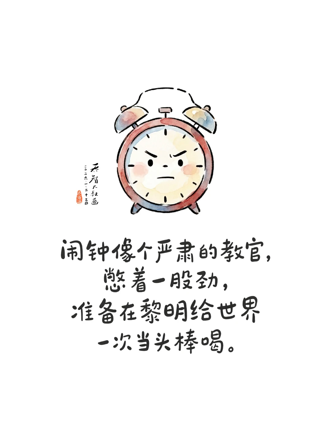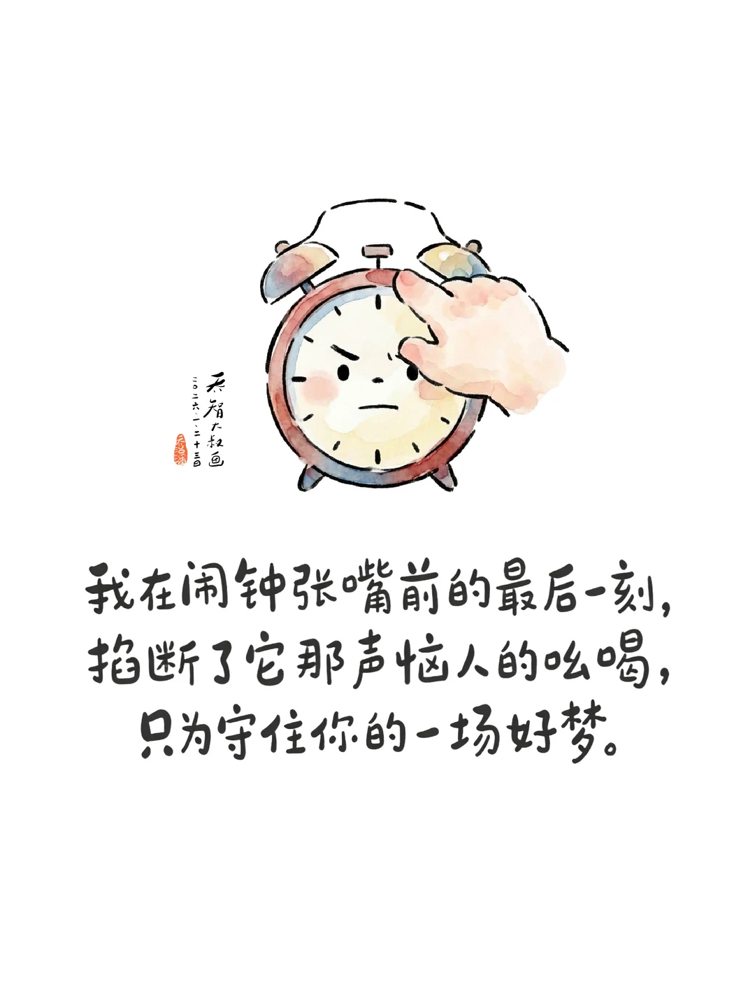 台灯的光还没撤 课本还摊在书桌的角落 📚 你揉着发红的眼对我说 妈,明早六点叫我 可别迟到啦 我看着你小小年纪 就在眼底泛起的青黑色 点点头,把闹钟 拨到那个,冰冷的时刻 ❄️ 闹钟在床头不声不响 像个严肃的教官 💂 憋着那股劲儿 准备在黎明时刻 给所有人,一次当头棒喝 我躺在被窝里 听着窗外的风 🌬️ 听着时针的嗒嗒 翻来覆去,辗转反侧 晨光还没撕开云朵 ☁️ 闹钟刚要张嘴巴 我果断出手 在它发声前的最后一刻 咔嗒一声,掐断了它 恼人的吆喝 🤫 — — 我蹲在床头,屏住呼吸 看着你微微颤动的睫毛 看你陷在梦里的小脸儿 像一朵还没被世界惊扰的,小棉花 ☁️ 我小声跟自己说话 让他再睡五分钟吧 ⏳ 还是我这个妈 做事太没原则啦 毕竟这是他 长身体的年纪 🥛 毕竟外面的世界 对他有太多的索取和责骂 风儿悄悄溜过来 吹起窗帘的一角纱 ✨ 它说别急别急 这五分钟的梦里 正开着一朵 现实里找不到的,七色花 🌈 这一刻的宁静 比满分的卷子 💯 更值得珍藏呀 后来,孩子开始奇怪 为什么那个闹钟,总是不响呀? 是不是坏掉啦? 我笑笑,不说话 😊 我要继续把我的秘密 藏到关掉闹钟的那个指尖下 如果你是那个 可恶的闹钟 我愿意做那个 永远让你“失灵”的妈妈 ❤️ 我亲爱的孩子 世界总在催你出发 而我只想让你在黎明破晓前 再多睡五分钟 💤 我也不知道这样对不对 我是不是一个,称职的妈妈 🍃