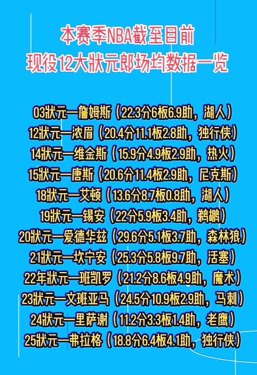 不出意外这个赛季的状元又少了几位,受伤的有,赋闲在家的有,远走海外的也有,但03的状元依旧是坚挺,真不敢想象这已经是他的第23个赛季了,数据依旧亮眼,就是防守差了点。 在欧文和浓眉都受伤的情况下,25年状元弗拉格有了更多出手机会,也给了他证明自己的时间,目前来看还是很不错的。 总的来说,所有状元都不差,特别是华子,文班和Cc尤为出色,球迷是不是有疑问?13,16和17年的状元是谁,发生了什么情况了?13年的在海外打球,而16年的却只爱传球不投篮的他还在健身房拍照片证明自己还很强,但没人签;而另一个却是无球队需要,甚为惋惜。