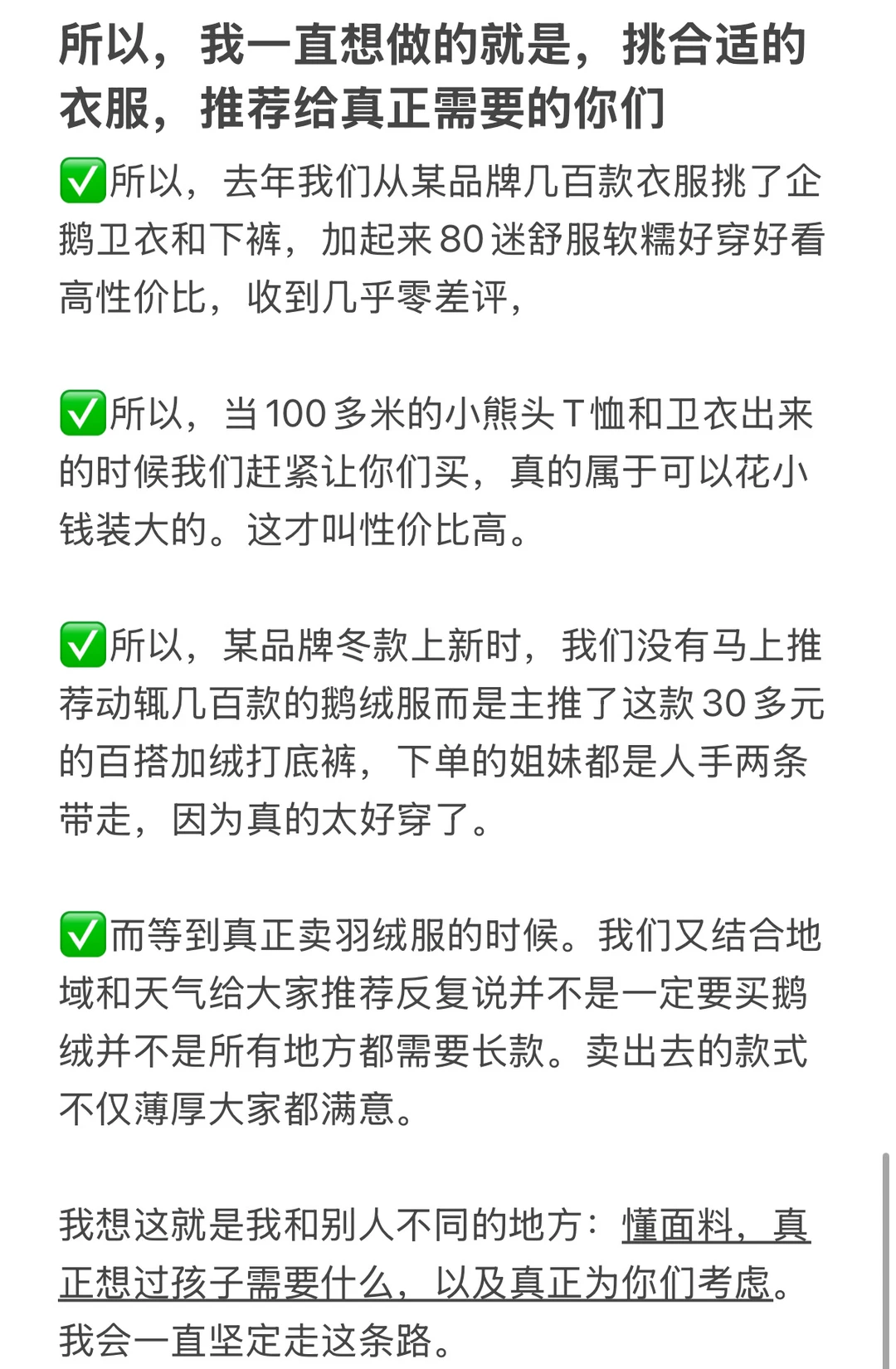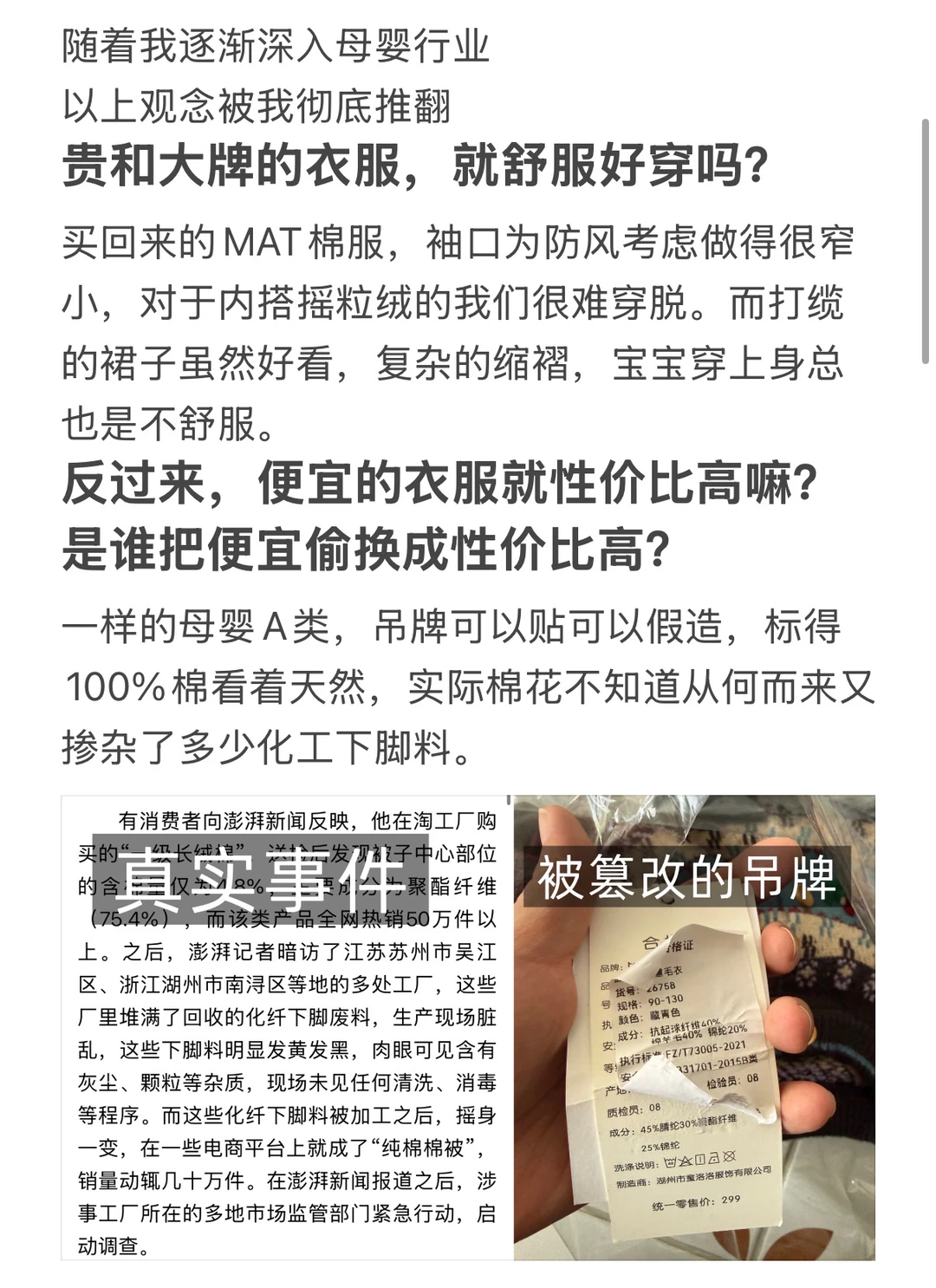 今天是大大的坦白局 真的很想和大家聊聊,到底要怎么给娃去买衣服 以及,我们到底是出于什么去给大家建议 毕竟,以下两种言论我都不是很喜欢: ✅把贵和大牌的衣服等同于就舒服好穿。 ✅把便宜的衣服偷换成性价比高? . 所以我们要去给娃挑选什么衣服 我觉得就是安全合适 这可能为我和别人不同的地方(不是拉踩):懂面料,真正想过孩子需要什么,以及真正为你们考虑。我会一直坚定走这条路。