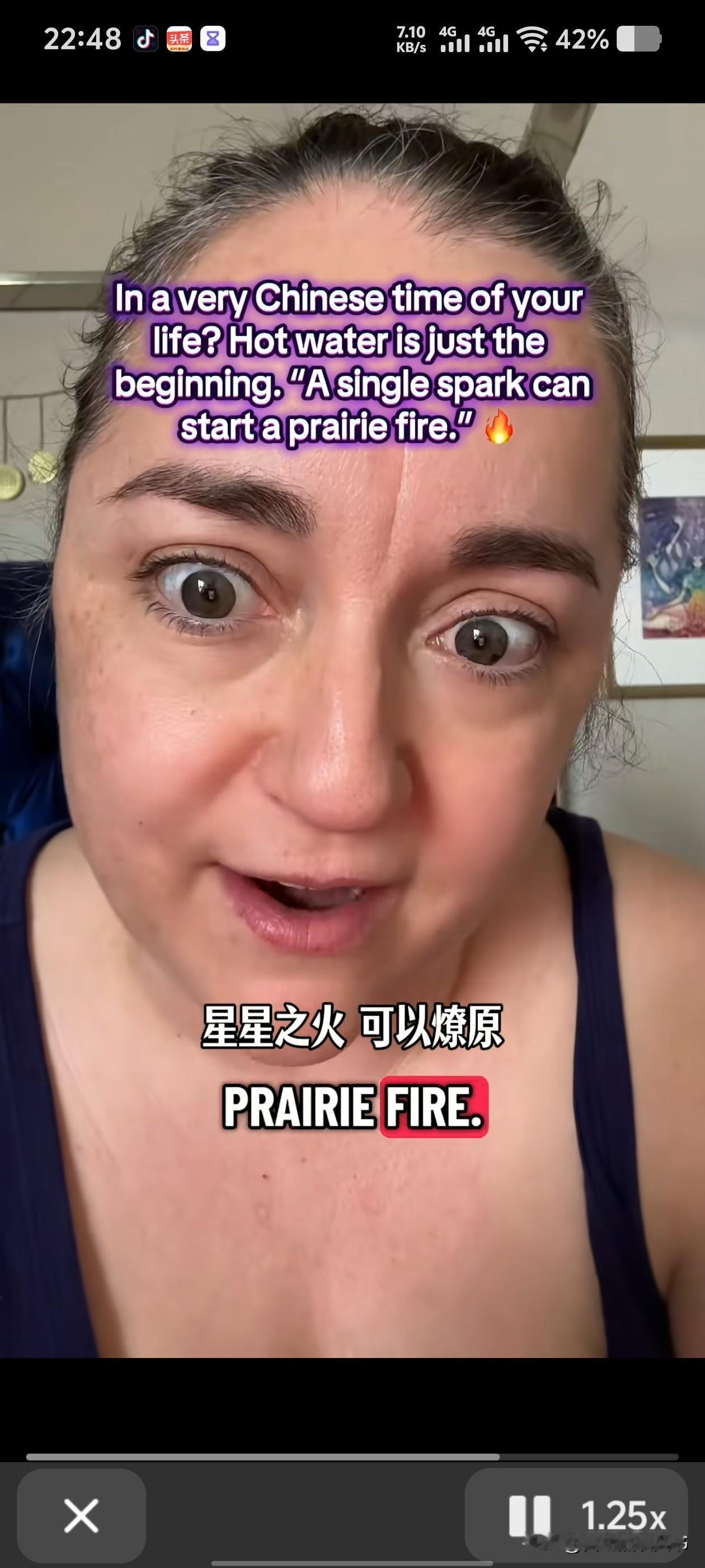 美国人找到了真的小红书——星星之火,可以燎原,这位美国大姐,习惯了中式养生之后,开始研究起了中国历史。 最初她是跟着网上的热门视频学习,喝热水,泡脚,短短一周的时间,她就觉得确实舒服了很多,因为正好处于特殊时期,发现喝热水确实要比冰水舒服多了。 一个月以后发现止疼药也不用吃了,而她做的只是改变了生活的一些小习惯,冰水换成热水,晚上回来泡脚,这让她感受到了中华文化的神奇,简简单单的两个动作,居然能够换来如此之大的好处。 闲暇时分,她就开始研究中国历史,在小红书上看中国网友的日常都在干些什么?都喜欢那些影视剧,那些歌曲? 直到她刷到了这八个字——星星之火,可以燎原,让她突然感觉开窍了。 怪不得美国要划分那么多的群体,那么多的标签,就是要把美国人群打散,打碎,让他们不能团结在一起。 她能想到这一点,已经很了不起了,智慧的升华就在一瞬间,但是影响却是非常深远的。