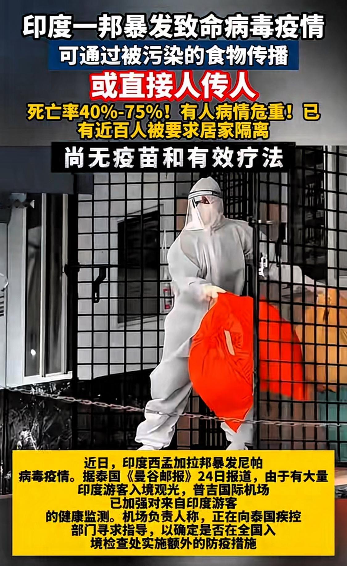 印度高致死率疫情突发,泰国、尼泊尔等国虽已加强印游客监测和口岸检疫,但我们没必要过多担心 近日,印度西孟加拉邦(特别是加尔各答附近)突发由尼帕病毒引发的疫情。目前已有包含有医护人员在内的至少5人被确诊、约100人被隔离。 尼帕病毒被世卫组织列为最危险的病毒之一,最早被发现于1998-1999年的马来西亚和新加坡。此后,尼帕病毒在孟加拉国、印度、菲律宾等地反复暴发,形成了两个主要谱系(马来西亚谱系和孟加拉国谱系)。 该病毒的传播途径主要是接触受感染的果蝠、被污染的食物(如生椰枣汁)、感染者的体液等,致死率高达40%-75%。 目前,全球尚无特效药和获批疫苗,治疗以支持性护理为主。 不过从历史来看,该疫情往往呈现出暴发突然、地点分散、病例总数相对较少的特点,且一般仅存在于南亚、东南亚部分地区。 而我国除了同印在地理上存在天然屏障,还拥有完备的常态化监测和预警体系,以及专门针对尼帕病毒的出入境动物检疫技术标准 ——《SN/T 2865-2024 尼帕病毒病检疫技术规范》。因此,该病毒想传入我国还是很难的,我们不需要过度为此担心。 何况,连制药公司都不愿投入资金和精力去研究这个早在二十多年前就被发现的病毒。可见,其危害性也就那样。