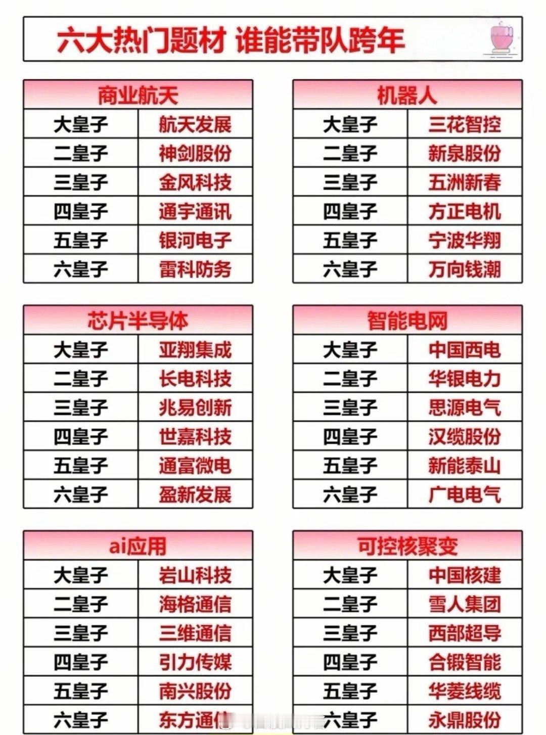 🚀跨年行情的“终极剧本”已悄然铺开,六大热门题材正摩拳擦掌,谁能扛起“跨年龙”的大旗,成为市场焦点?从商业航天到可控核聚变,各赛道龙头蓄势待发,主线之争悬念拉满——存储芯片赛道因AI大模型爆发迎来东风,高端存储需求随算力基建加速扩张而激增,产业链上下游已显露出清晰的增长曲线;智能电网则手握国家电网未来五年超2万亿投资的“定心丸”,基建落地带来的行业红利正在逐步释放;而可控核聚变一旦实现商业化落地,或将彻底重塑全球能源格局,万亿级市场空间的想象空间令人瞩目……此外,机器人、芯片半导体、AI应用等赛道也各有看点,技术突破与政策催化交织,让跨年行情的走向更添变数。究竟哪一题材能突出重围?是硬核科技领跑,还是能源革新异军突起?这场跨年冲锋的大戏,正等待市场给出答案。注:以上仅为题材梳理,不构成投资建议,股市有风险,入市需谨慎,资料取材网络仅供参考。