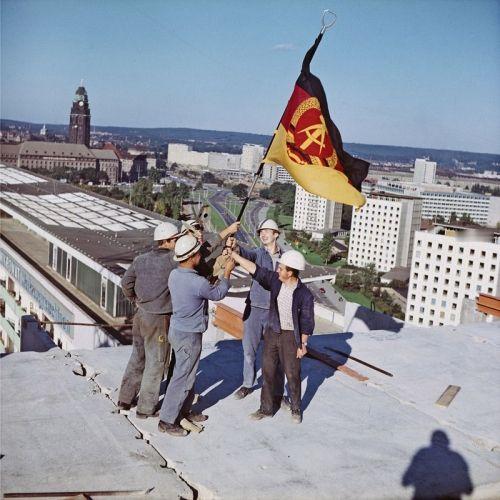 1970 年代,建筑工人在新建成的德累斯顿 Interhotel Newa 酒店屋顶上升起东德国旗。