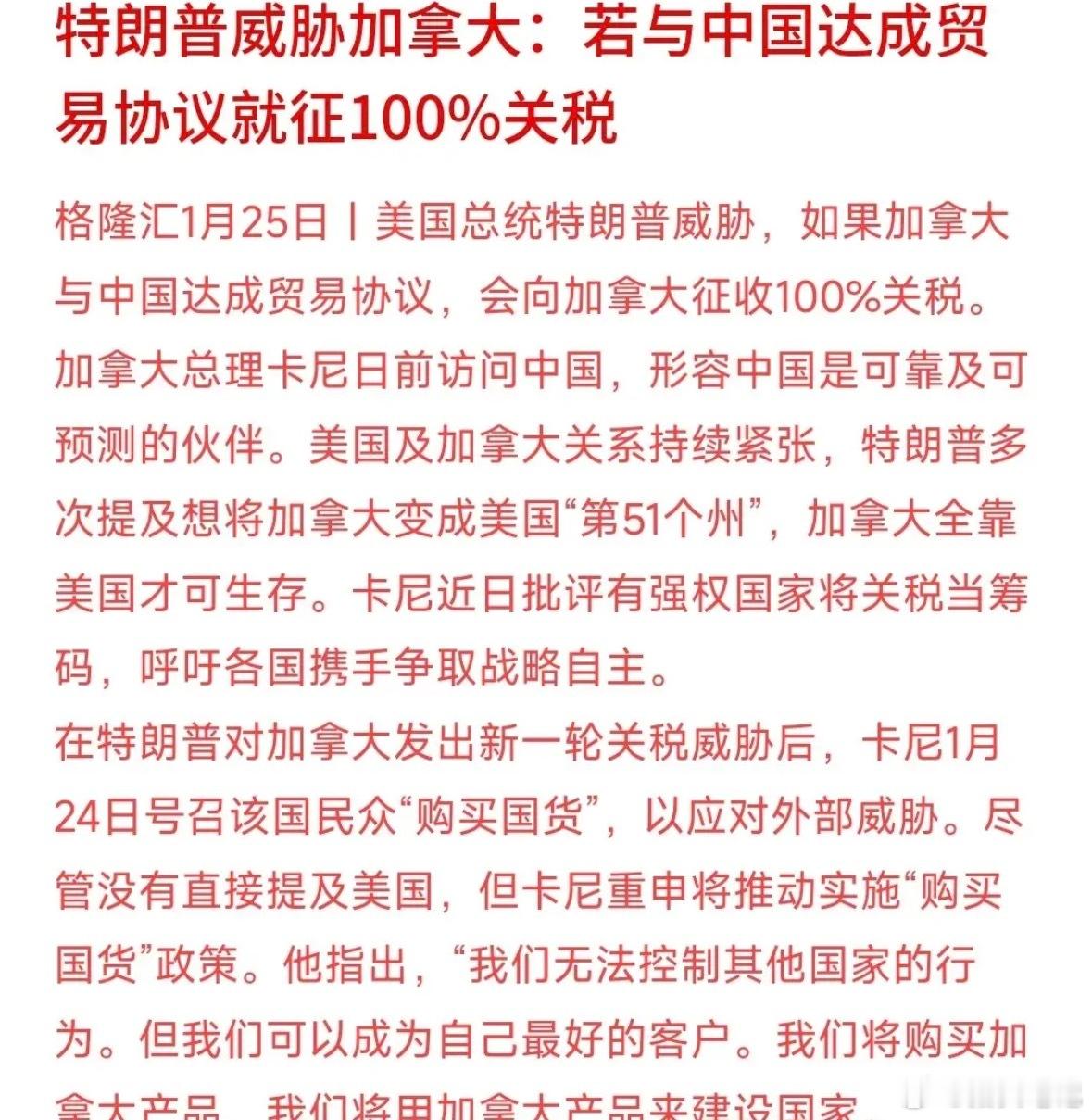中加谈妥贸易合作,特朗普急眼了,扬言要对加拿大加征100%关税,典型的自己搞不了自由贸易,也不让别人好好做生意。中加这次谈的很实在:加拿大给中国电动车每年4.9万辆配额,配额内关税从100%砍到6.1%;中方3月前把加拿大油菜籽综合税率从85%降到15%左右,重启农产品贸易。这本是中加双方的事,特朗普之所以横加阻拦,说到底是不想加拿大经济摆脱美国牵制,毕竟他一直想把加绑死在自己身边。不过看加拿大这边的态度,中加这笔合作大概率能成,特朗普怕是要气到跳脚了。