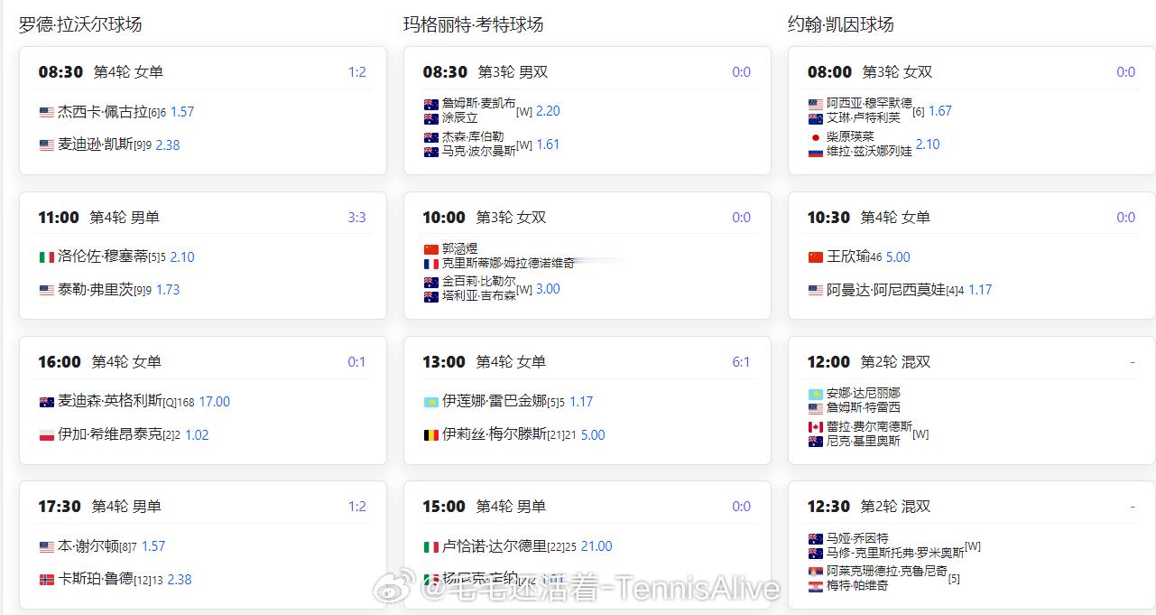 【1月26日澳网第9日比赛赛程+直播赛程】 8:30佩古拉vs凯斯10:30王欣瑜vs阿尼西莫娃 13:00莱巴金娜vs梅尔滕斯16:00斯瓦泰克vs英格利斯15:00辛纳vs达尔德里17:30鲁德vs谢尔顿