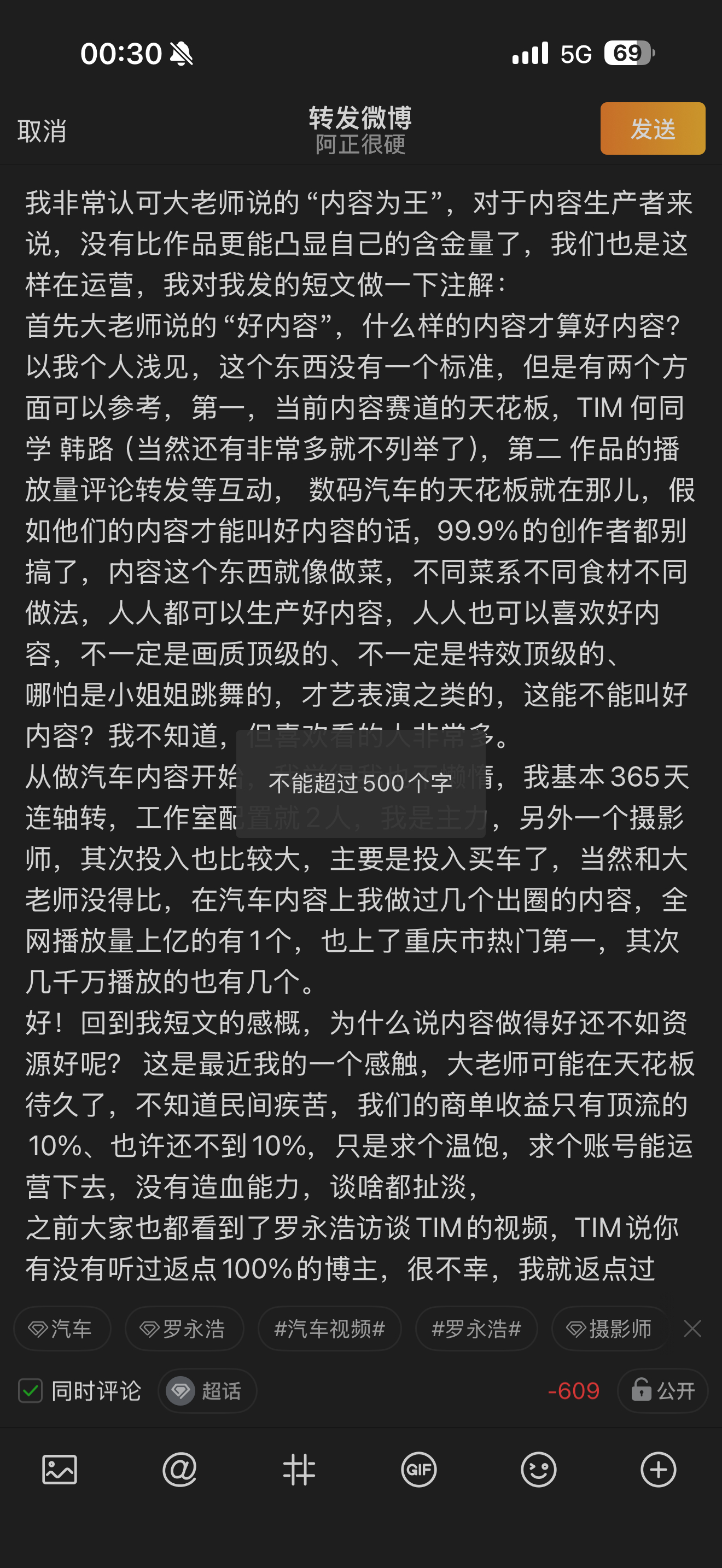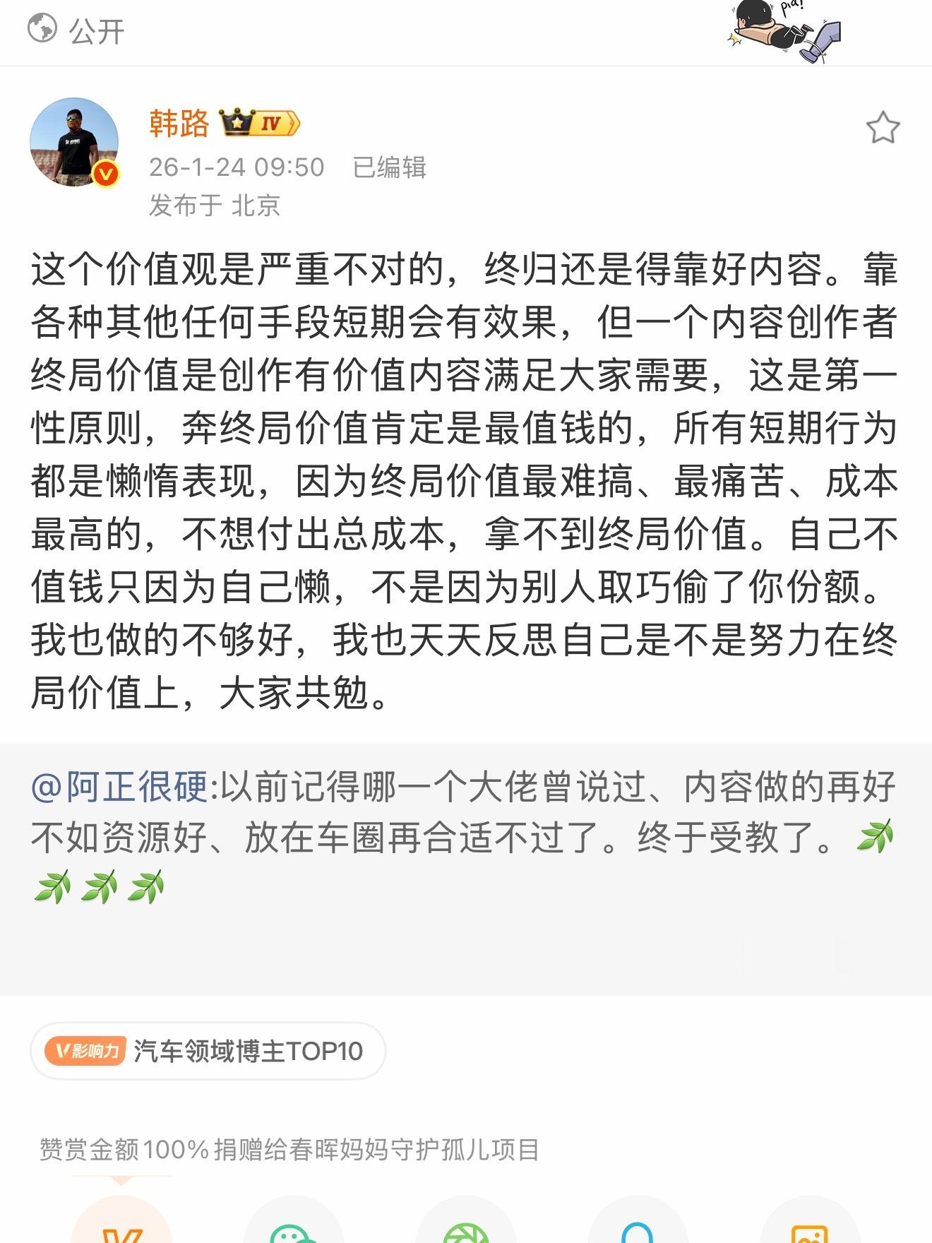 我非常认可大老师说的“内容为王”,对于内容生产者来说,没有比作品更能凸显自己的含金量了,当然我们也是这样在运营,我对我发的短文做一下注解:首先大老师说的“好内容”,什么样的内容才算好内容? 以我个人浅见,这个东西没有一个标准,但是有两个方面可以参考,第一,当前内容赛道的天花板,TIM 何同学 韩路 (当然还有非常多就不列举了),第二 作品的播放量评论转发等互动, 数码汽车的天花板就在那儿,假如他们的内容才能叫好内容的话,99.9%的创作者都别搞了,内容这个东西就像做菜,不同菜系不同食材不同做法,人人都可以生产好内容,人人也可以喜欢好内容,不一定是画质顶级的、不一定是特效顶级的、哪怕是小姐姐跳舞的,才艺表演之类的,这能不能叫好内容?我不知道,但喜欢看的人非常多。从做汽车内容开始,我觉得我也不懒惰,我基本365天连轴转,工作室配置就2人,我是主力,另外一个摄影师,其次投入也比较大,主要是投入买车了,当然和大老师没得比,在汽车内容上我做过几个出圈的内容,全网播放量上亿的有1个,也上了重庆市热门第一,其次几千万播放的也有几个。好!回到我短文的感概,为什么说内容做得好还不如资源好呢? 这是最近我的一个感触,大老师可能在天花板待久了,不知道民间疾苦,我们的商单收益只有顶流的10%、也许还不到10%,只是求个温饱,求个账号能运营下去,没有造血能力,谈啥都扯淡,之前大家也都看到了罗永浩访谈TIM的视频,TIM说你有没有听过返点100%的博主,很不幸,我就返点过100%,只做过一次,之后再也没接了,即使正常接商单,同样要给高额返点,30% 40% 50%甚至更高,屁股下面的车圈小博主就是这样。没有高额返点根本接不了单,只有询单,就没有下文了。我为什么那么生气的发了这个短文呢? 因为我遇到一个事儿,参加一个车的活动,比如大家都是差不多的博主,相互认识一下、但我给那个车圈博主打招呼,他爱答不理非常冷淡,但转头过去和厂商公关PR点头哈腰,那个谄媚的样儿,真让我打开眼界。所以对于屁股以下的博主2026年相当困难,这是我的现状,不代表所有,屁股以下的博主免费吹厂商没有功劳也没有苦劳,啥也没有,厂商当你不存在,当你透明的、这是当下创作者最难受的、即没商单也没有精神上的寄托。