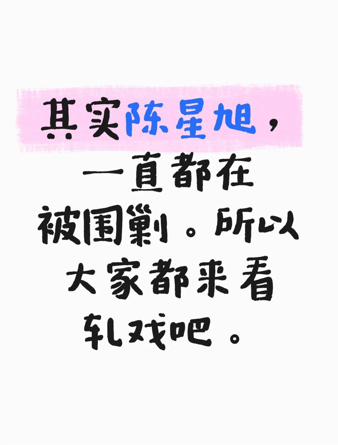 陈星旭收官小作文争议,传到现在只能说一句陈星旭无妄之灾,按头嘿的东西也不知道谁在信。轧戏其实真的是一部很不错的现偶,陈星旭全程都在认认真真安利剧,呼吁大家追剧,结果从开播就被一路围剿到现在收官,一直都没消停过,陈星旭实惨,不能看九日老实就这么欺负吧。
