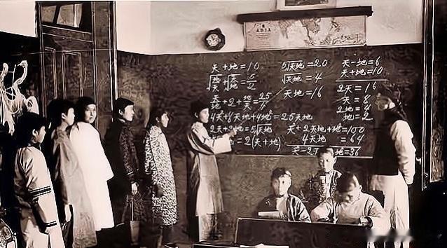 清末镇江女子中学的数学课堂,黑板上的“天、地”代表未知数,相当于我们现在数学里的X和Y。