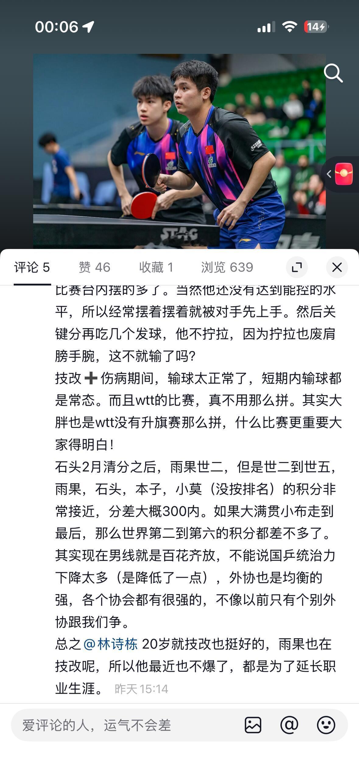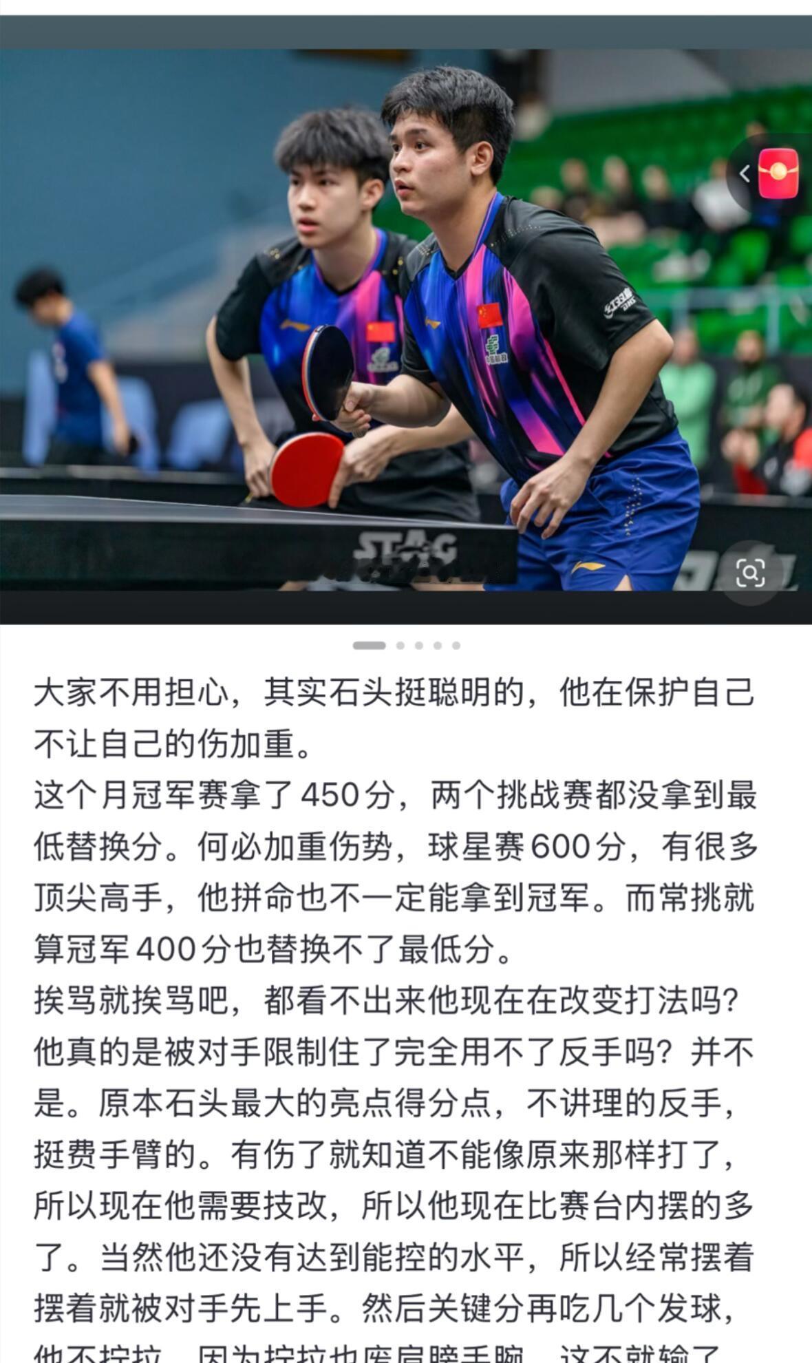 就说小石头他没事,他可以调节好的,输给了小黄又如何。还是很棒的! 林诗栋比黄友政大不了几天,也就50天,结果叫小黄,真是把自己当大哥哥弟弟模范了,长大了,有带头的样子了! 小石头其实是受伤了,要不然水平更高,状态是差点,我就知道栋宝不受伤的话不可能这个水平,运动生涯还很长,期待栋宝满血复活,下一场球赛轻松上阵,健康涨球!