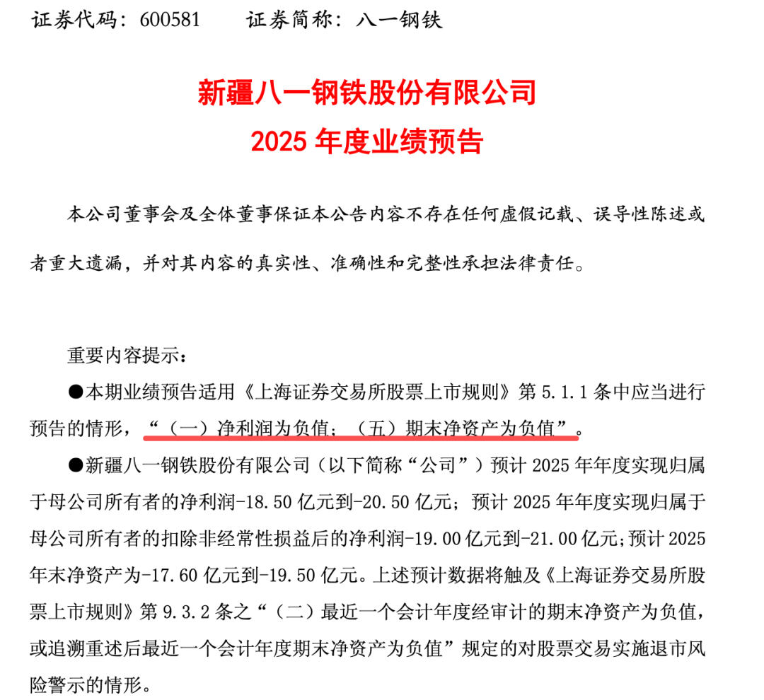 八一钢铁1月25日晚同步公告,上述预计数据将触及《上海证券交易所股票上市规则》第9.3.2条之“(二)最近一个会计年度经审计的期末净资产为负值,或追溯重述后最近一个会计年度期末净资产为负值”规定的对股票交易实施退市风险警示的情形。公司在2025年年度报告披露后,公司股票将可能被实施退市风险警示(在公司股票简称前冠以“*ST”字样)。