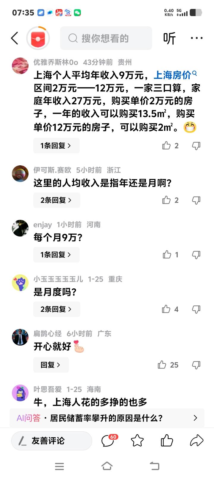 上海人均收入首破9万真相:我拖了全国后腿,却不敢告诉家人工资条上的数字 (来源:时代周报) 当朋友圈刷屏“上海人均收入破9万”的新闻时,我正挤在早高峰的地铁里,盯着手机银行余额发呆。那个数字离九万有多远?大概隔着房租、房贷、孩子的补习费和永远凑不够的首付。原来,我和人均收入之间,差了一整个黄浦江的波澜。 数据不会说谎,却最会掩盖真相。上海91987元的人均收入背后,是陆家嘴金融精英的年终奖,是互联网大厂的股权激励,也是弄堂里阿姨收租的流水账。把这些数字平均在一起,就成了光鲜的“人均”。可对于每天加班到深夜的普通白领,这九万更像镜中月水中花,看得见摸不着。 翻看榜单,全国11个省份迈过4万元门槛。江苏、广东、福建的邻居们纷纷晒出工资条,可更多省份的沉默震耳欲聋。在西南山区,四万可能是一个家庭全年的希望;在东北老工业区,那是多少下岗工人不敢奢望的数字。平均数的游戏里,有人被高高举起,就有人被悄悄遗忘。 消费数据更戳心窝。上海北京人均消费破5万,可你知道这意味着什么吗?意味着孩子上一节钢琴课500元,意味着老人生病住三天院花掉半月工资,意味着年轻人不敢恋爱不敢结婚。那些增长7.7%的家电消费,有多少是咬牙换掉的十年旧冰箱?数据里的“消费升级”,落到现实里可能就是“生存硬扛”。 有趣的是,北京上海的消费占比竟不到60%。不是这里的人不爱花钱,而是高收入给了他们储蓄的底气。而在消费占比超70%的省份,每一分钱都要精打细算。当西部家庭把七成收入用于日常开支时,“促进消费”的口号听起来多么奢侈。这不是选择,而是别无选择。 看看评论区就知道,多少人对着“人均”苦笑着点了赞。“我又拖后腿了”成为年度最扎心自嘲。但拖后腿的真是我们吗?当外卖骑手在风雨中跑单,当程序员在深夜改代码,当教师在灯下批改作业——他们真的不够努力吗?或许该问的是,经济增长的红利,究竟有多少流向了普通人的口袋? 好消息是政策正在转向。国家密集出台增收计划,稳就业、提保障、拓渠道。这不再是冷冰冰的文件,而是千万家庭盼着的曙光。当内蒙古、辽宁、重庆跻身“4万俱乐部”,我们看到的不只是数字变化,更是区域发展失衡的破局可能。 最后想起那个经典问题:月薪多少才能在一线城市体面生活?答案在每个人心里。但可以肯定的是,真正的共同富裕,不是把平均数拉高,而是让最慢的那艘船也能跟上舰队。当有一天,我们不再讨论“拖没拖后腿”,而是安心看着工资条说“今年又进步了”——那才是数据最有温度的瞬间。 收入真相 消费压力