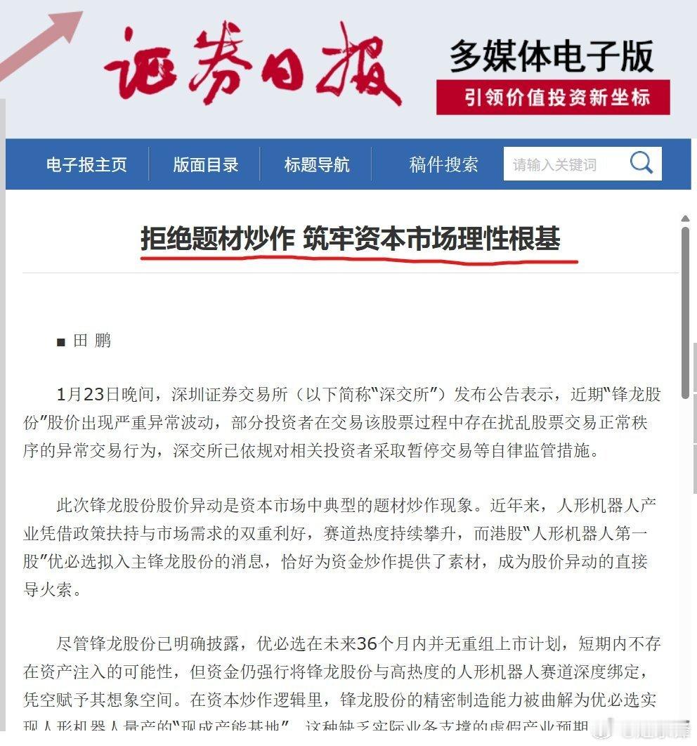 证券日报:拒绝题材炒作 筑牢资本市场理性根基需要明确的是,监管部门的一系列举措并非打压热门赛道,而是清晰划定“真价值”与“伪炒作”的边界:重点打击脱离公司基本面、借助题材概念实施资金控盘、从事异常交易的投机行为