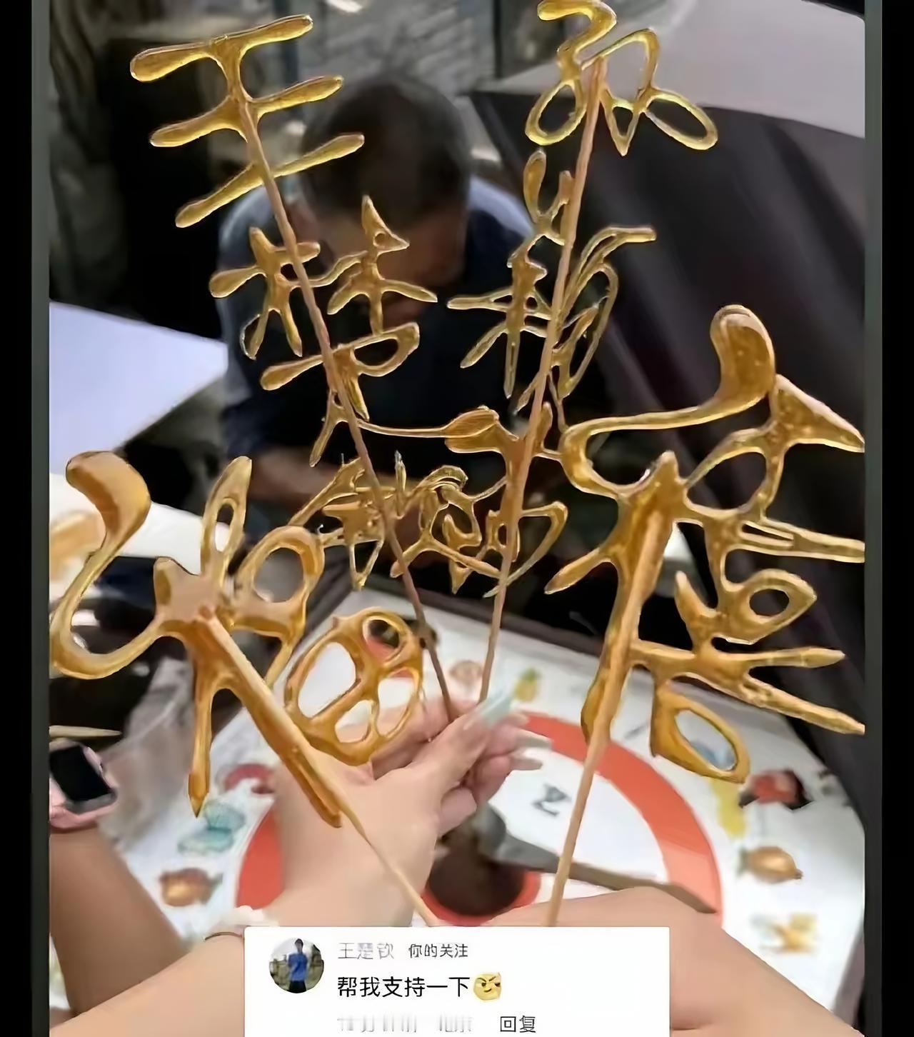 吃“王楚钦”! 这是一件新鲜事, 还真发生升级了! 又有了吃“孙颖莎”, 吃“莎头”, 王楚钦本人亲自捧场, 让闫安支持老板一下, 就是让闫安吃“王楚钦”, 这可不是在赛场上, 让闫安“吃”自己的球哟! 闫安两口子去鼓楼逛吃逛喝玩, 他发现有个卖糖画的摊位很有意思, 有个糖画就是王楚钦三个字, 和王楚钦本人的笔迹很像, 做糖画的老板总有这样的技能, 做糖画也是我们的传统文化, 吃糖画是老北京人童年的回忆, 挺有趣的! 闫安将这个糖画的图片发在Vlog中, 王楚钦这位“冲浪少年”刷到了, 在下面留言:帮我支持老板一下。 闫安回话:老板有眼光! 这个老板确实有眼光, 他不仅仅有“王楚钦”三个字的糖画, 还有“孙颖莎”三个字的, 两个糖画放在一起, 围着的是“莎头”两个字的, 老板有生意头脑, 光顾的人一定很多。 特别是王楚钦与闫安的互动, 给他做了免费的宣传呀! 这也说明王楚钦人品很好, 面对吃“王楚钦”这个事, 他不仅不恼, 还特地让朋友支持一下, 难道他不知道他一留言, 就是为糖画摊主免费宣传, “王楚钦”的糖画会火吗? 肯定知道呀! 在巴黎奥运会回来之后, 王楚钦、孙颖莎、邱贻可、肖战指导加上刘诗雯的五人直播中, 肖战指导提到莎莎的绿茶, 王楚钦说, 给绿茶打了一波广告, 还有王楚钦的苏打水, 孙颖莎说, 给苏打水也打了一波广告, 只要和他们两个人有关的, 从轿车到日常生活用品, 哪一样的销量都很好, 他们两个人就是流量密码, 糖画会火也就不足为奇了。 对此您怎么看? 欢迎大家留言讨论!