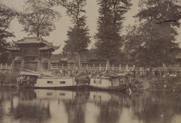 1870年,嘉定孔庙前汇龙潭边,两艘客船停靠在汇龙潭畔,船边聚集着迎接宾客的人群,孔庙的棂星门与殿宇清晰可见。汇龙潭不仅是孔庙的配套水系,也是嘉定古城的重要水路枢纽。在交通以水运为主的晚清,这里是文人雅士、官员乡绅往来孔庙的必经之处。 嘉定孔庙始建于南宋,是江南地区保存最完整的孔庙之一。在清代,它不仅是地方官学的所在地,也是嘉定及周边县考生参加府试、院试的核心场所。每逢科举考期,汇龙潭边都会聚集大量考生、家属与观礼民众,照片中的场景正是这一日常盛况的缩影。