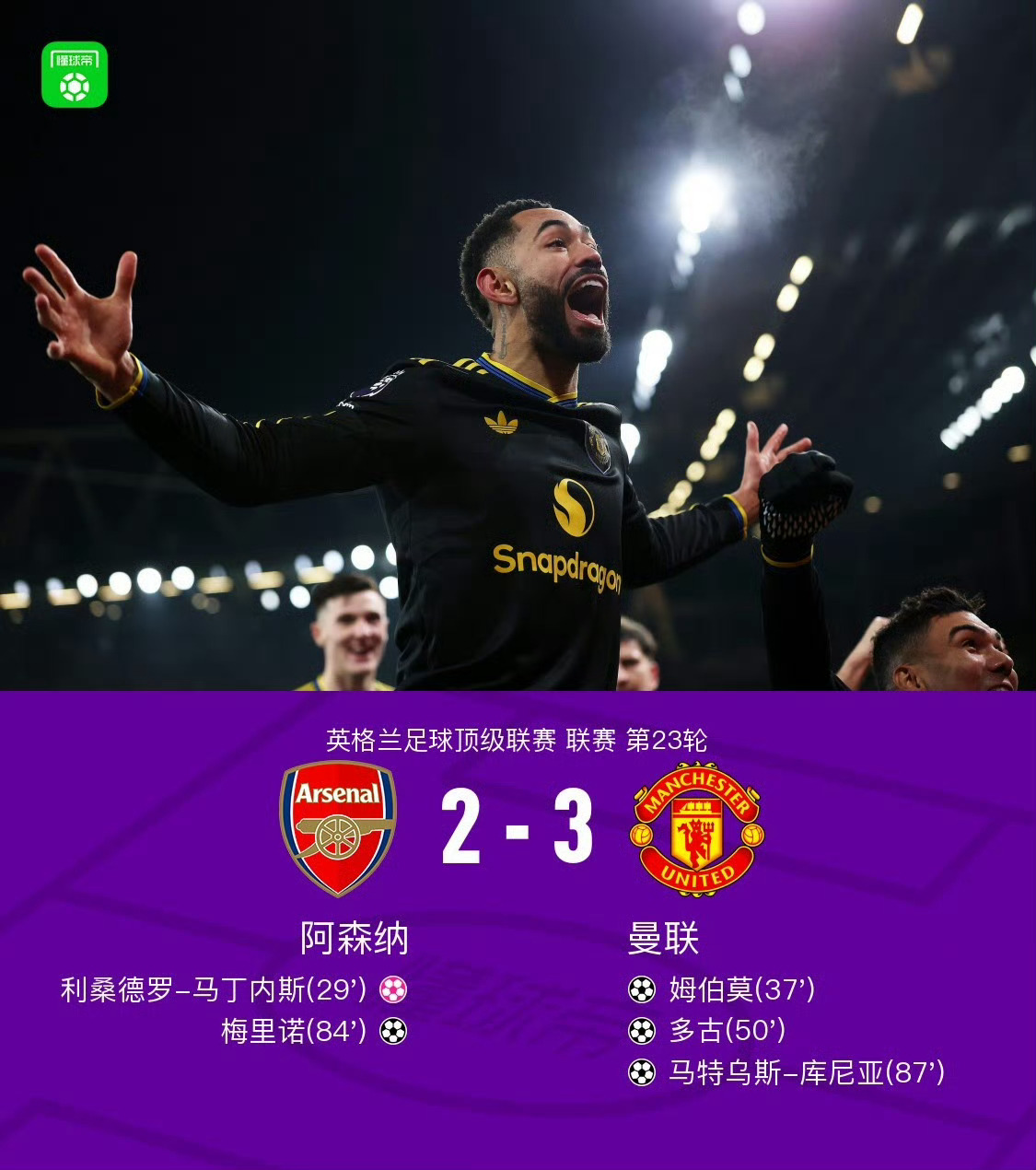 阿森纳2比3曼联曼联终结自2025年8月以来对阿森纳6场不胜的尴尬纪录,终结阿森纳主场对曼联联赛5连胜。 阿森纳遭遇本赛季主场首败,近121场正式比赛首次单场丢3球。天下武功,唯快不破。爽!从此走上专治各种不服的道路了呗?卡里克凭借这两场胜利可以转正了吧?还用找主教练吗?下赛季引进个好的后腰和中后卫,再来个马泰塔这种黑旋风,把齐尔克泽换掉。这不就妥妥开启复兴之路了吗?