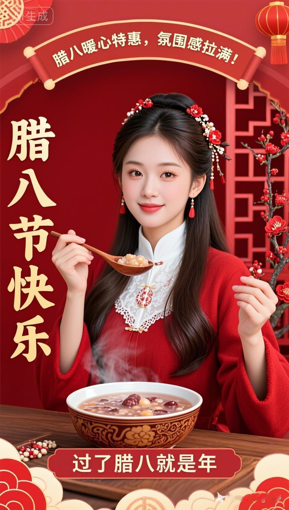 腊八暖心特惠,正红背景年味浓。红木台雕花碗腊八粥热气袅袅,冷白皮美女着红国风冬装配白蕾丝领,半扎发饰红梅,持勺舀粥笑意甜,红梅枝、镂空红框、烫金题字点缀,暖冬盛宴邀共赴。