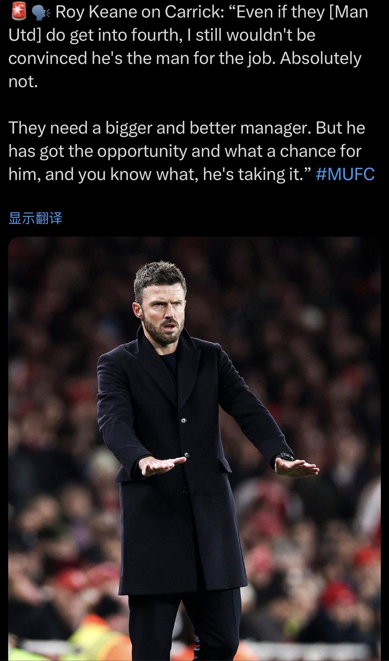 都是为了流量[发怒],曼联毒瘤名宿! 基恩谈卡里克:“即使他们(曼联)最终排名第四,我仍然不相信他是这份工作的最佳人选。绝对不是。” 他们需要一位更优秀、更有魄力的经理。但他得到了这个机会,而且对他来说是多么难得的机会啊,你知道吗,他抓住了这个机会。”