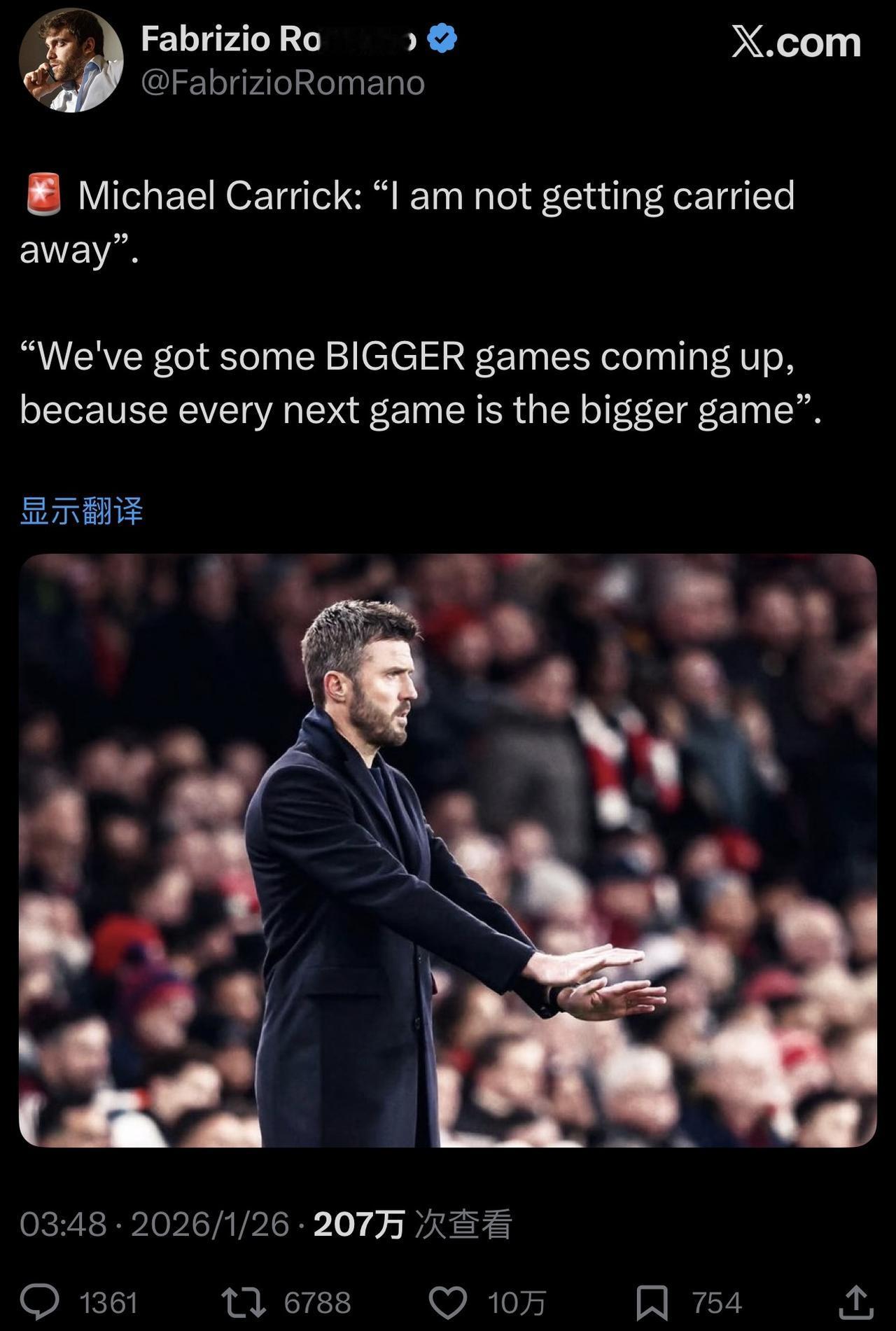 还是那句话,想回Big6位置,踢中下游球队才是关键! ……………………………………………………………… 迈克尔·卡里克:“我没有得意忘形”。 “接下来我们将迎来一些更重要的比赛,因为每一场比赛都是更重要的比赛。”