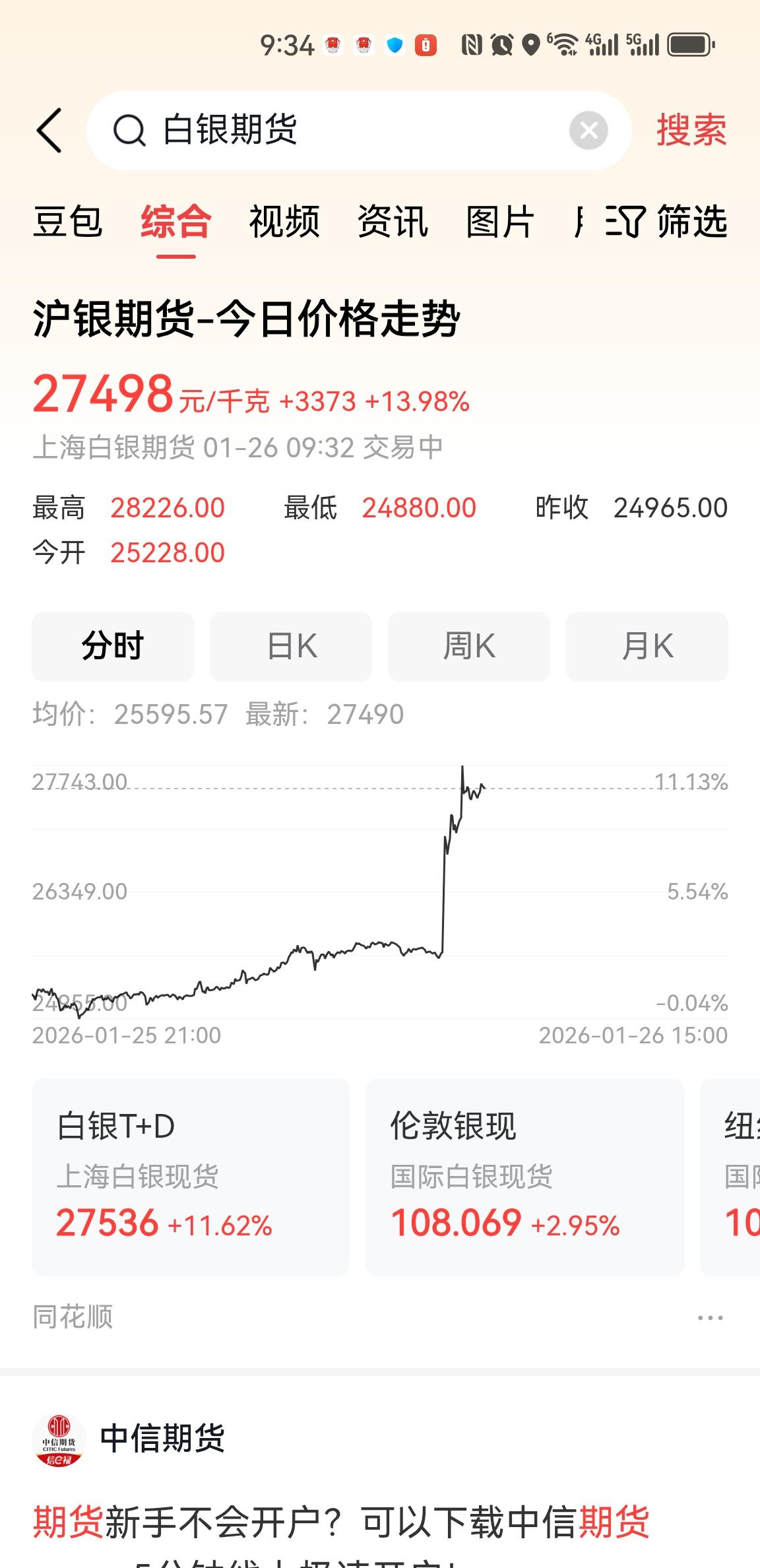 🚀白银彻底疯狂!沪银狂飙14%,伦敦银突破108美元! 今天的白银市场直接杀疯了!💥 沪银期货开盘后直线拉升,涨幅一度突破14%,价格冲到27498元/千克,创下近期新高。 伦敦银现货同步暴涨,价格突破108美元/盎司,纽约白银也跟涨。 这波史诗级暴涨背后,是全球避险情绪升温与货币宽松预期的双重驱动。 市场预计,今天临时停牌一个小时的国投白银LOF(161226)10:30复牌后大概率会直接涨停。 白银作为兼具贵金属和工业属性的品种,在当前全球经济不确定性加剧的背景下,正在成为资金的“避风港”。 这波上涨的持续性值得高度关注,后续可以重点关注美联储政策动向和地缘局势变化。 🔥 你觉得这波白银行情能走多远?评论区聊聊你的看法!