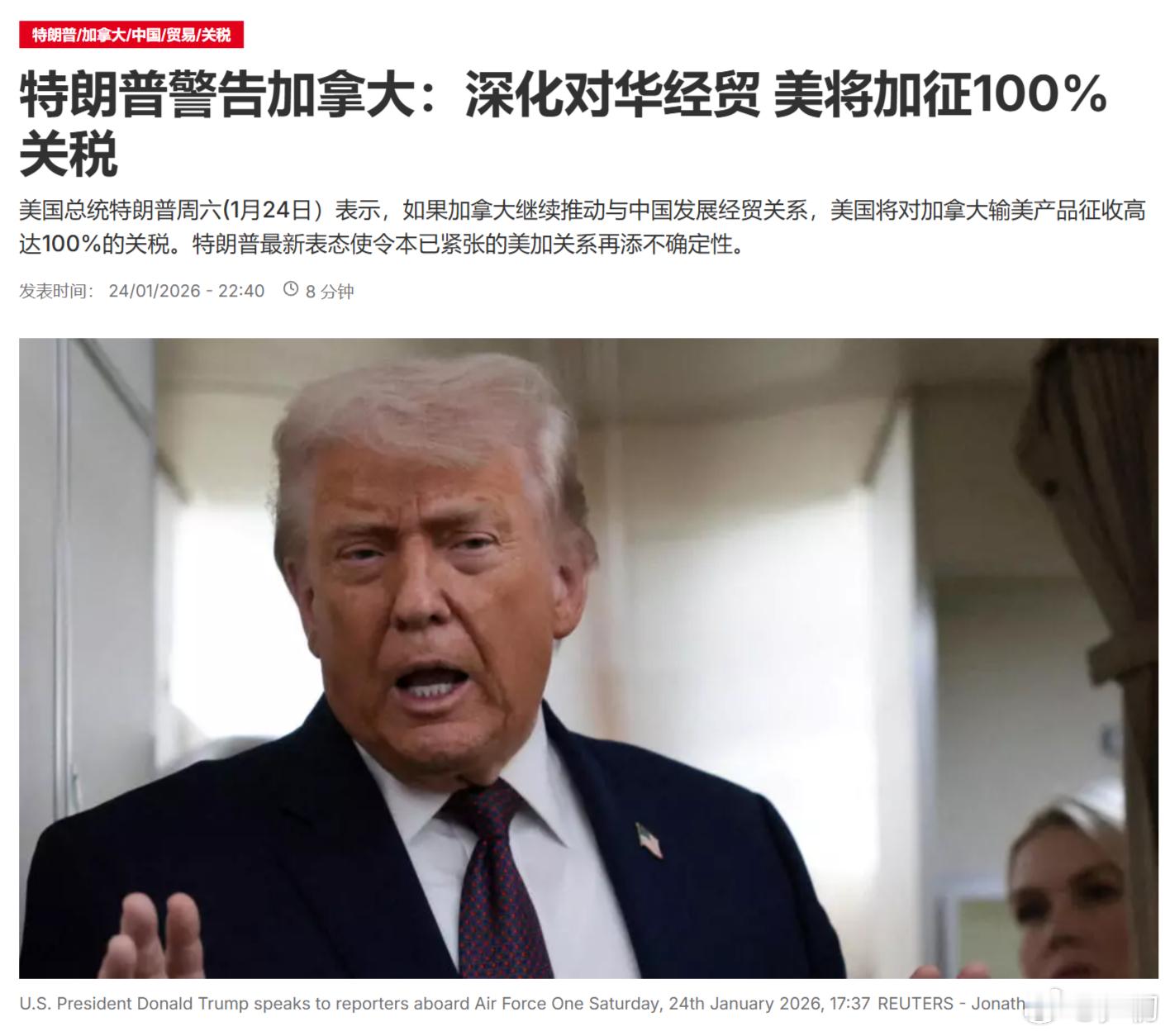 美国总统特朗普警告加拿大:如果继续深化对华经贸,美将加征100%关税。对此一位加拿大学者表示:为什么美国可以跟中国签署贸易协议,加拿大却不行?