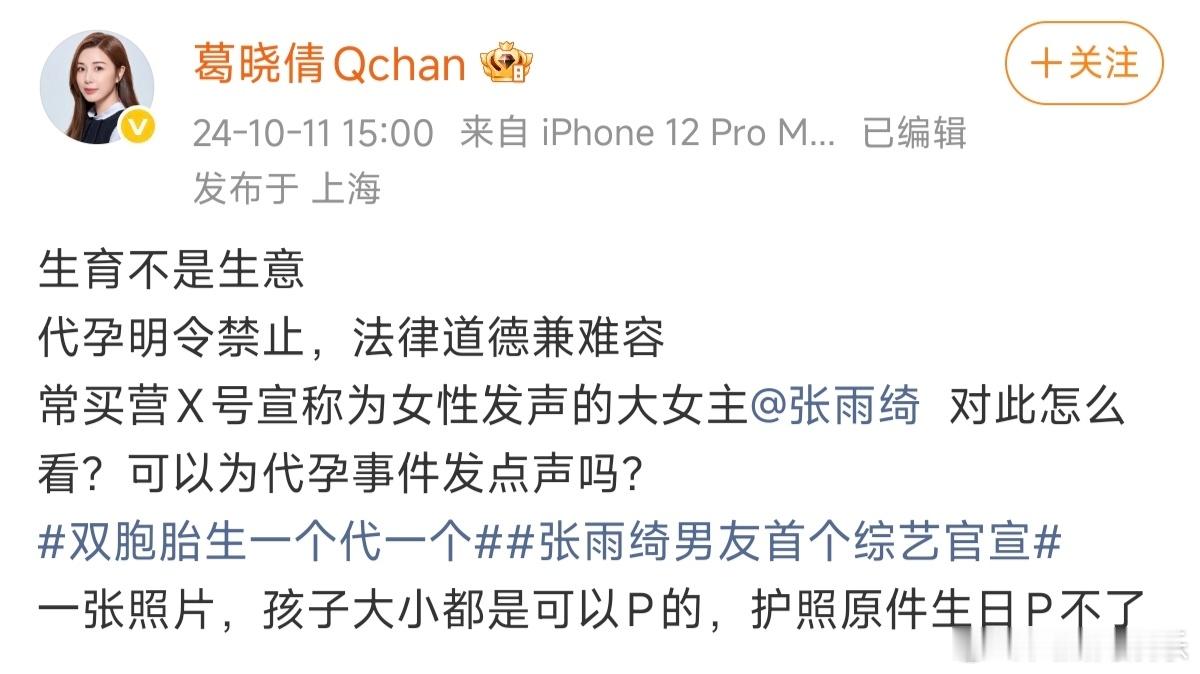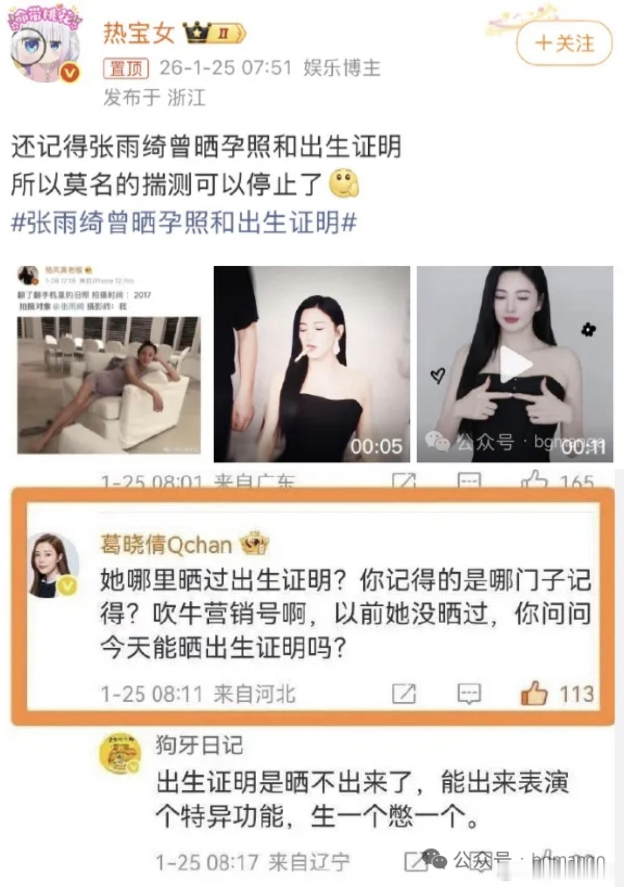 葛晓倩爆料张雨绮时间线梳理葛晓倩再爆料张雨绮1月24日,演员张雨绮与葛晓倩之间的恩怨风波再起。大致时间线梳理如下:2024年10月,她在微博发文表示张雨绮当年插足了她的婚姻,称2016年通过家中监控发现张某在她与袁巴元未离婚期间多次出入自己的住所,与子女、保姆共处。而她通过放在家中的行李照片,观察到上面的登机标签清楚地写有“yuqi zhang”。同时,她还爆料张雨绮涉及代孕。她发文“生育不是生意,代孕明令禁止”,并在文中直接对此怎么看?其出示的经公证后的一张护照信息上,写有两名子女出生日期分别为2017年7月与10月,间隔仅3个月,与正常妊娠周期不符。随后,她又表示接到了匿名变声电话,对方精准掌握其家庭住址、家人信息,仅留下一句“保重”便匆匆挂断,她当即报警。2026年1月24日,时隔一年后,葛晓倩再发文表示,据警方调查结果,当时对其实施威胁的两位神秘人是孙姓、范姓两名律师。2026年1月25日,话题张雨绮曾晒孕照和出生证明登上热搜,葛晓倩在相关博文下评论打假,称张雨绮晒过孕照,但并未晒过出生证明。(综合大河报)