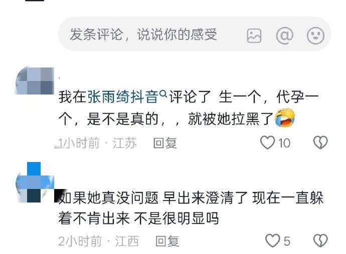 是不是钱挣的多了,就喜欢整一些花样出来。 就张雨绮被曝代孕,插足婚姻这个事,我看是八九不离十了,不然以她的性子,工作室会迟迟不正面回应这个事?有时候真挺想不通的,这么有钱,就非得干点这种事吗?不能务实一点,参考上一个代孕的郑爽,她几乎损失了在圈子里这么多年的全部努力,据说如今在美国过着连普通人的日子。 自从张雨绮说过一次“699元买不了一双丝袜”我就知道此人绝不简单,这次的事情如果处理不好,那么她面临的境遇可能比郑爽也好不了多少哦!毕竟我们对于劣迹艺人的态度,就只有坚决抵制。