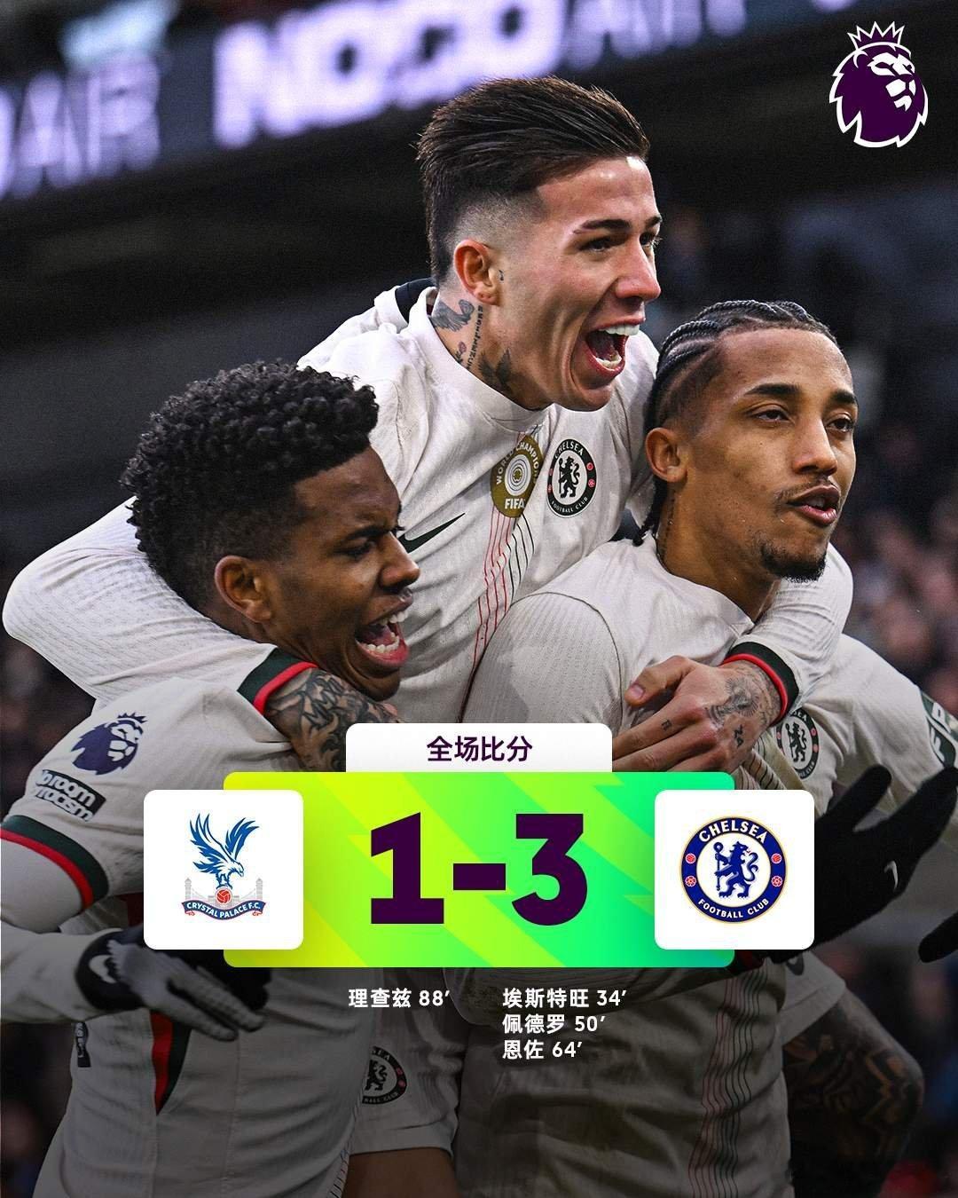 切尔西3-1客胜水晶宫,拿下伦敦德比!此役,埃斯特旺传射,佩德罗破门+造点,恩佐点射建功!三位南美球员助蓝军取得三连胜!水晶宫1比3切尔西