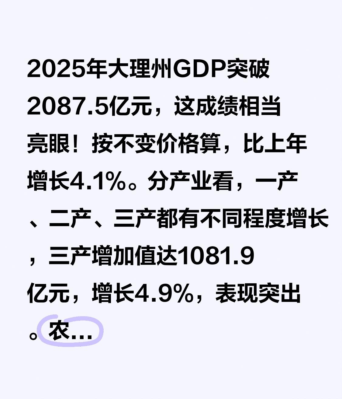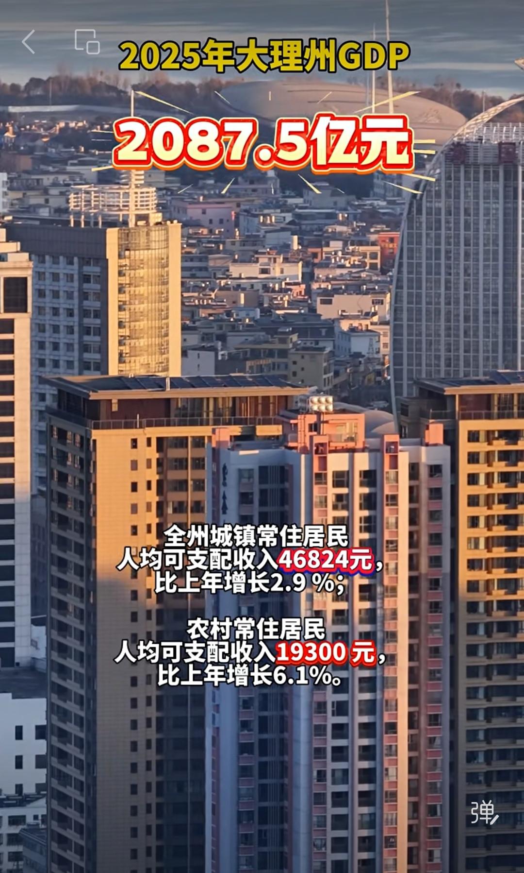 2025年大理州GDP突破2087.5亿元,这成绩相当亮眼!按不变价格算,比上年增长4.1%。 分产业看,一产、二产、三产都有不同程度增长,三产增加值达1081.9亿元,增长4.9%,表现突出。 农业方面,全州农林牧渔业总产值774.9亿元,同比增长3.5%,增速逐季提升。拿大理市来说,1 - 2季度全体居民人均可支配收入22710元,同比增长4.4%,城乡居民收入都大幅增长。 看来大理州在经济发展上真的下了功夫,未来肯定会越来越好!